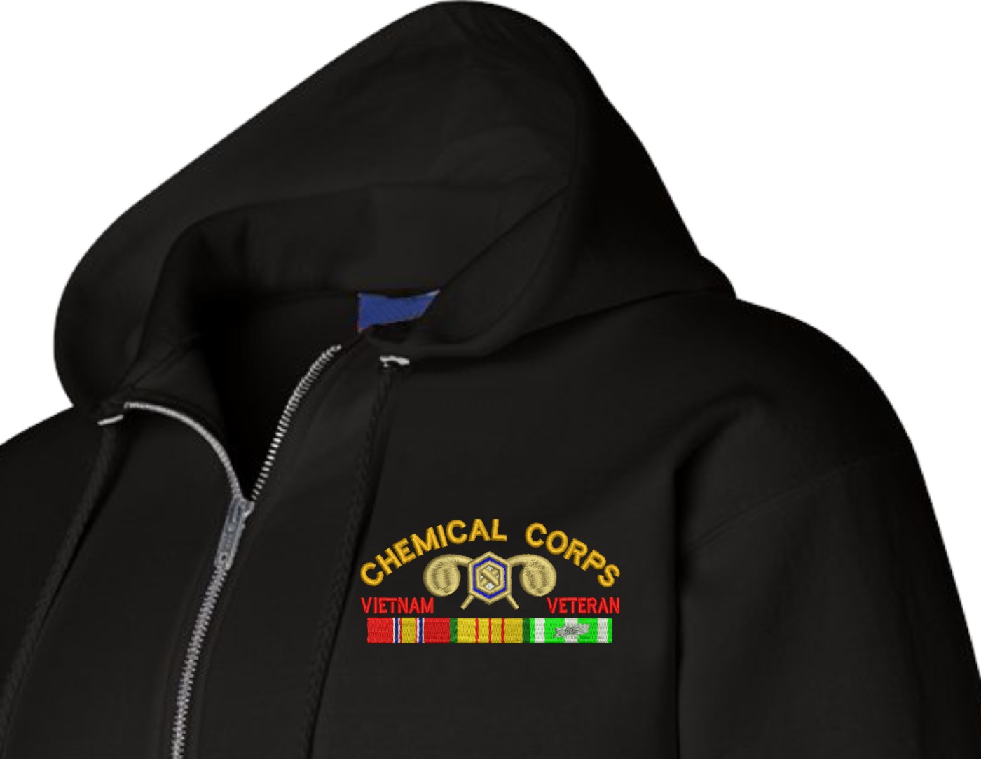 MilitaryBest has expanded its line of apparel with this custom embroidered U.S. Army Chemical Corps Vietnam Veteran Zippered Hoodie. Each Hoodie is direct embroidered onto a Champion brand 9.5 oz 50/50 Cotton Poly blend. This will make an excellent addition to your wardrobe, or a great gift. Your satisfaction is Guaranteed! These quality zippered hoodies are proudly embroidered at our facilities in Scottsboro, AL. Support the Army MWR program by purchasing only from Licensed Vendors. To all of our Vietnam Veterans, Welcome Home!