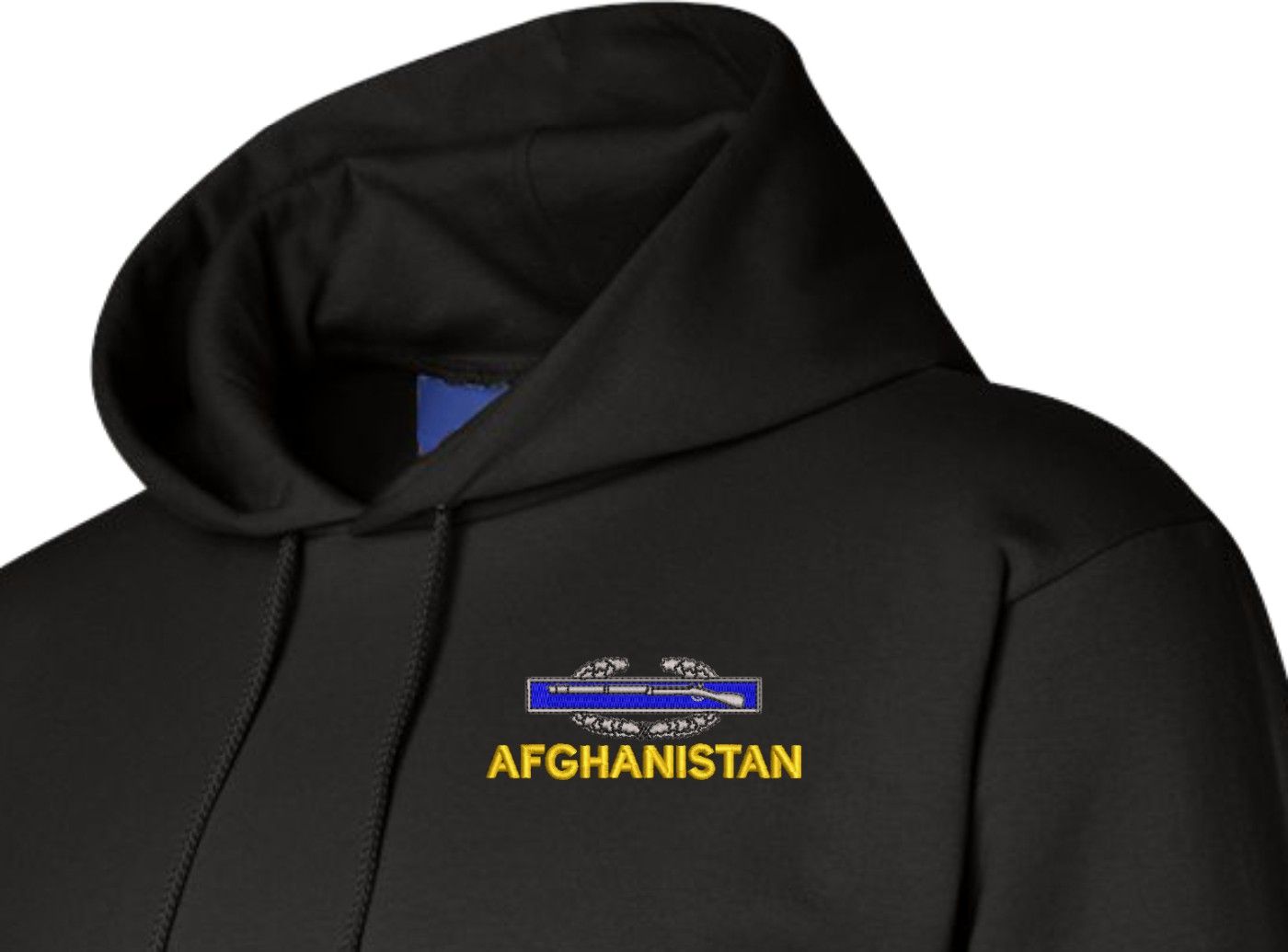 MilitaryBest has expanded its line of apparel with this custom embroidered U.S. Army Afghanistan Combat Infantry Badge(CIB) Hoodie. Each Hoodie is direct embroidered onto a Champion brand 9.5 oz 50/50 Cotton Poly blend. This U.S. Army Afghanistan Combat Infantry Badge(CIB) Hoodie will make an excellent addition to your wardrobe, or a great gift. Your satisfaction is Guaranteed! This U.S. Army Afghanistan Combat Infantry Badge(CIB) Hoodie is custom embroidered at our facilities in Scottsboro, AL.