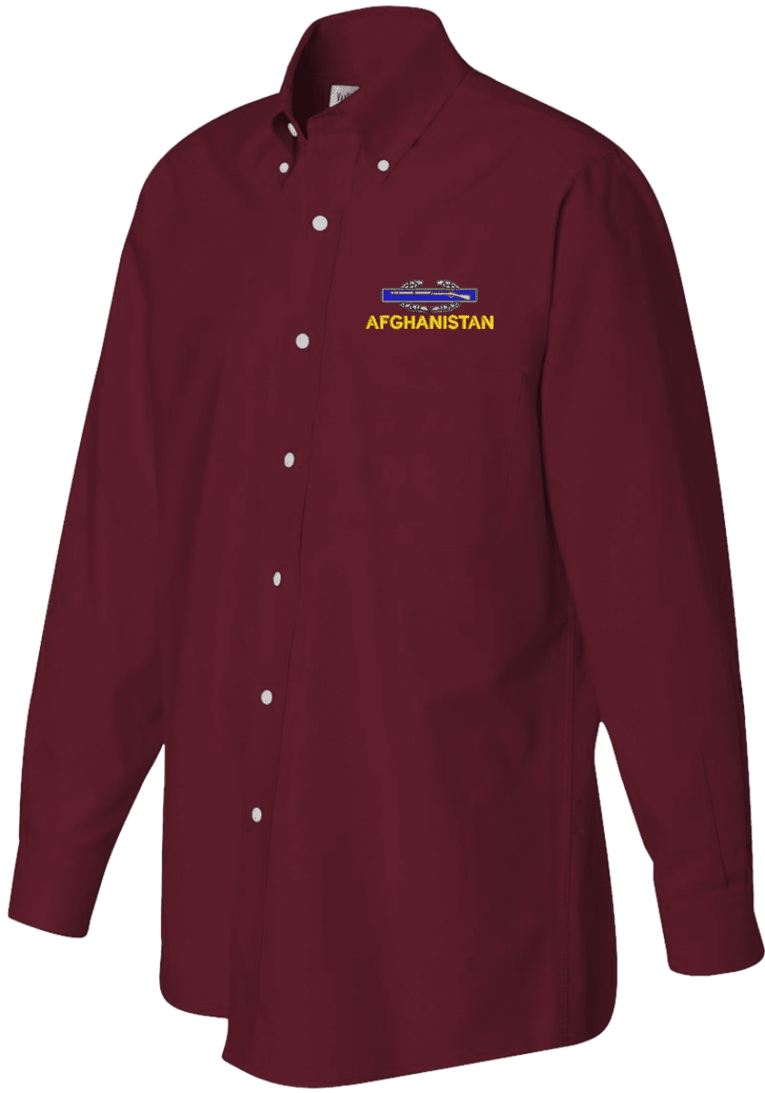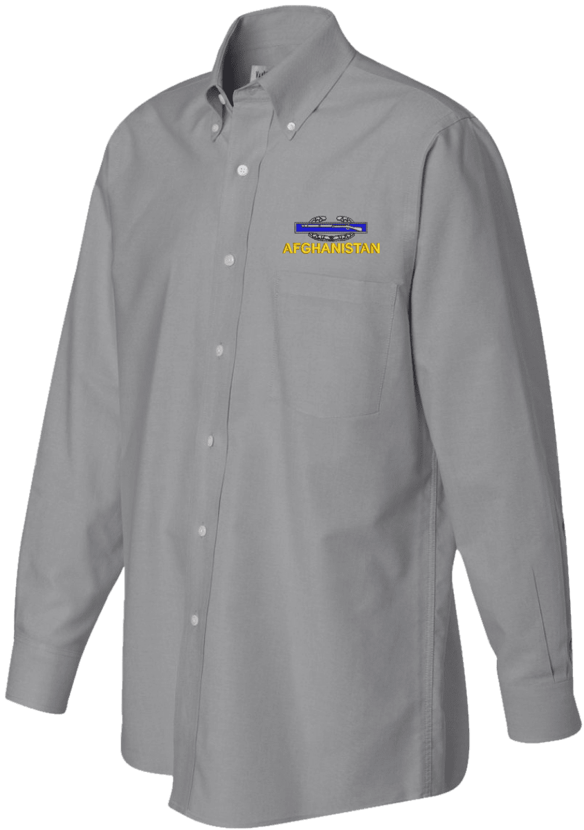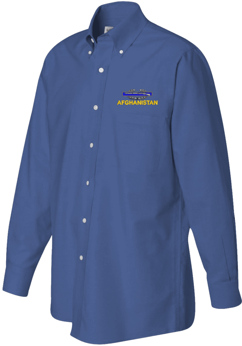 Note: Some of the Color Options pictured may not be available. Available Color Options are listed on the drop down menu above.MilitaryBest has expanded its line of apparel with this custom embroidered U.S. Army Afghanistan Combat Infantry Badge(CIB) Oxford Shirt. This Van Heusen brand Oxford long sleeve button down dress shirt is made using a wrinkle-free, pill and stain resistant 60/40 cotton/polyester material. This U.S. Army Afghanistan Combat Infantry Badge(CIB) Oxford Shirt will make an excellent addition to your wardrobe or a quality gift. This U.S. Army Afghanistan Combat Infantry Badge(CIB) Oxford Shirt is custom embroidered at our facilities in Scottsboro, Alabama.