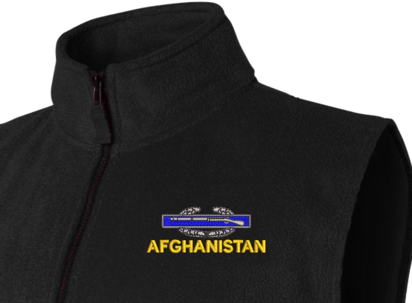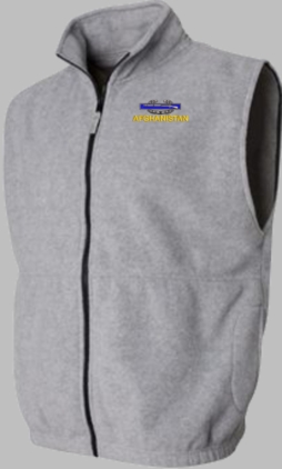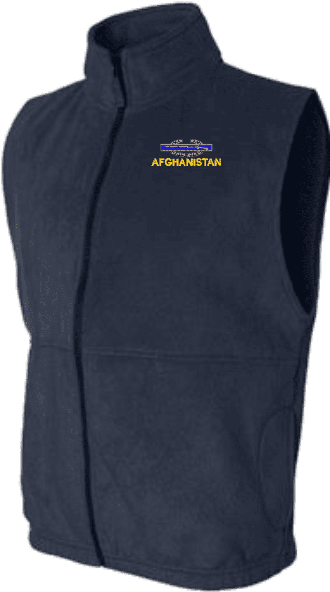 Due to supply chain disruptions, some colors and sizes may not be available in the same Brand, in these cases a brand of comparable quality will be used. Feel free to call in advance of your order, with questions you may have.MilitaryBest is expanding its line of Men's apparel with this quality U.S. Army Afghanistan Combat Infantry Badge(CIB) Full-Zip Fleece Vest. This U.S. Army Afghanistan Combat Infantry Badge(CIB) Full-Zip Fleece Vest features a convertible collar with dyed-to-match zipper pull, oversized nylon reinforced slash pockets, and an elastic hem. It is made using a 100% anti-pill polyester Fleece Vest. This U.S. Army Afghanistan Combat Infantry Badge(CIB) Full-Zip Fleece Vest will make an excellent addition to your wardrobe, or a quality gift. Your satisfaction is guaranteed! These Vests are custom embroidered at our facilities in Scottsboro, AL.