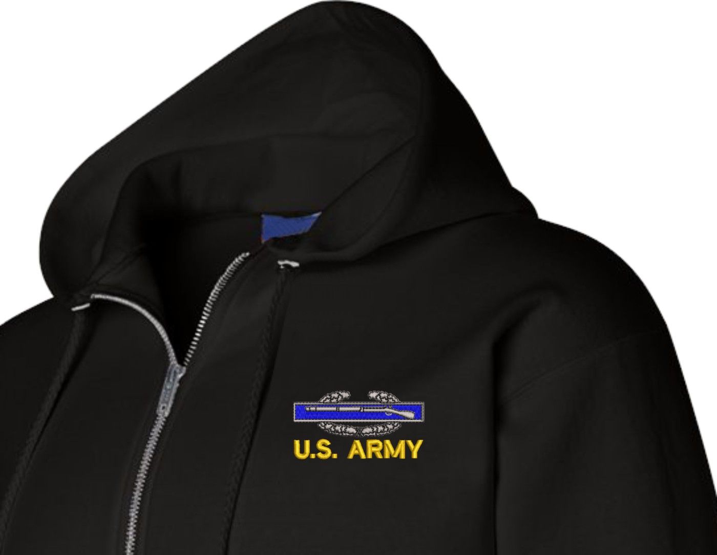 MilitaryBest has expanded its line of apparel with this custom embroidered U.S. Army Combat Infantry Badge(CIB) Full Zip Hoodie. Each Hoodie is direct embroidered onto a Champion brand 9.5 oz 50/50 Cotton Poly blend. This U.S. Army Combat Infantry Badge(CIB) Full Zip Hoodie will make an excellent addition to your wardrobe, or a great gift. Your satisfaction is Guaranteed! This U.S. Army Combat Infantry Badge(CIB) Full Zip Hoodie is custom embroidered at our facilities in Scottsboro, AL.