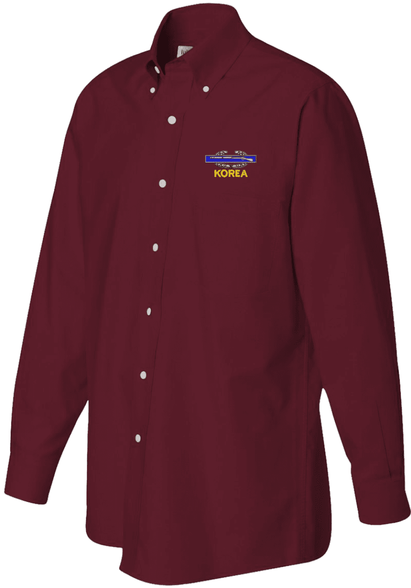 Note: Some of the Color Options pictured may not be available. Available Color Options are listed on the drop down menu above.MilitaryBest has expanded its line of apparel with this custom embroidered U.S. Army Korea Combat Infantry Badge(CIB) Oxford Shirt. This Van Heusen brand Oxford long sleeve button down dress shirt is made using a wrinkle-free, pill and stain resistant 60/40 cotton/polyester material. This U.S. Army Korea Combat Infantry Badge(CIB) Oxford Shirt will make an excellent addition to your wardrobe or a quality gift. This U.S. Army Korea Combat Infantry Badge(CIB) Oxford Shirt is custom embroidered at our facilities in Scottsboro, Alabama.