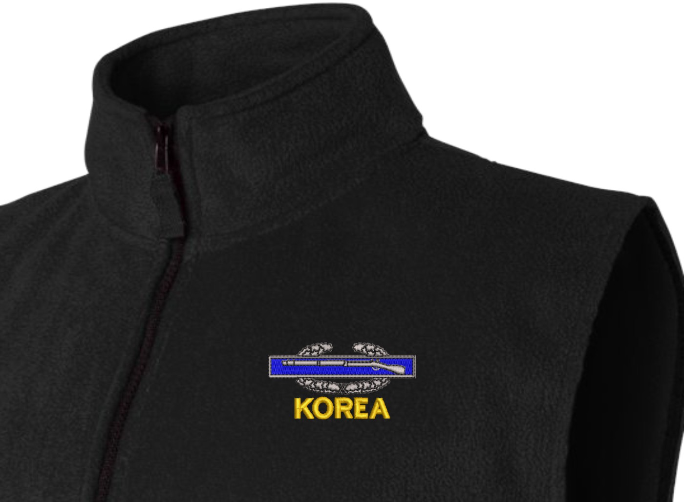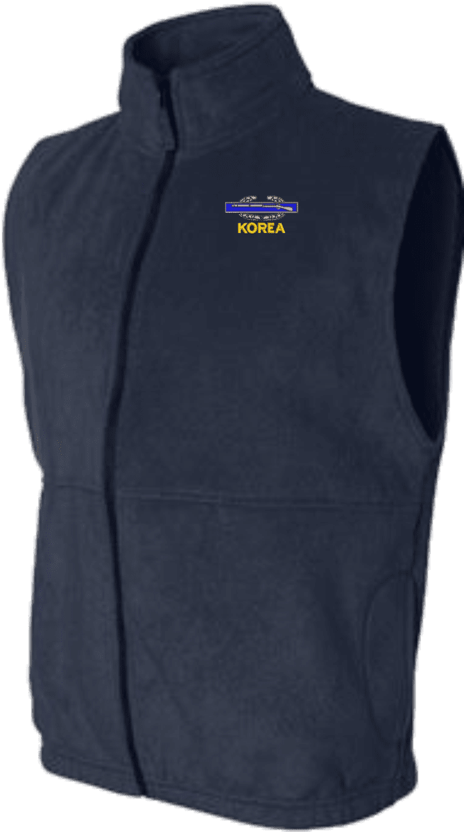 Due to supply chain disruptions, some colors and sizes may not be available in the same Brand, in these cases a brand of comparable quality will be used. Feel free to call in advance of your order, with questions you may have.MilitaryBest is expanding its line of Men's apparel with this quality U.S. Army Korea Combat Infantry Badge(CIB) Full-Zip Fleece Vest. This U.S. Army Korea Combat Infantry Badge(CIB) Full-Zip Fleece Vest features a convertible collar with dyed-to-match zipper pull, oversized nylon reinforced slash pockets, and an elastic hem. It is made using a 100% anti-pill polyester Fleece Vest. This U.S. Army Korea Combat Infantry Badge(CIB) Full-Zip Fleece Vest will make an excellent addition to your wardrobe, or a quality gift. Your satisfaction is guaranteed! These Vests are custom embroidered at our facilities in Scottsboro, AL.