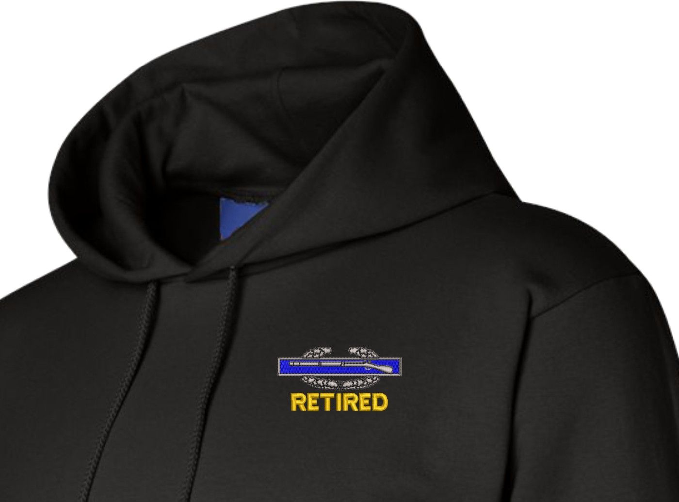 MilitaryBest has expanded its line of apparel with this custom embroidered U.S. Army Retired Combat Infantry Badge(CIB) Hoodie. Each Hoodie is direct embroidered onto a Champion brand 9.5 oz 50/50 Cotton Poly blend. This U.S. Army Retired Combat Infantry Badge(CIB) Hoodie will make an excellent addition to your wardrobe, or a great gift. Your satisfaction is Guaranteed! This U.S. Army Retired Combat Infantry Badge(CIB) Hoodie is custom embroidered at our facilities in Scottsboro, AL.