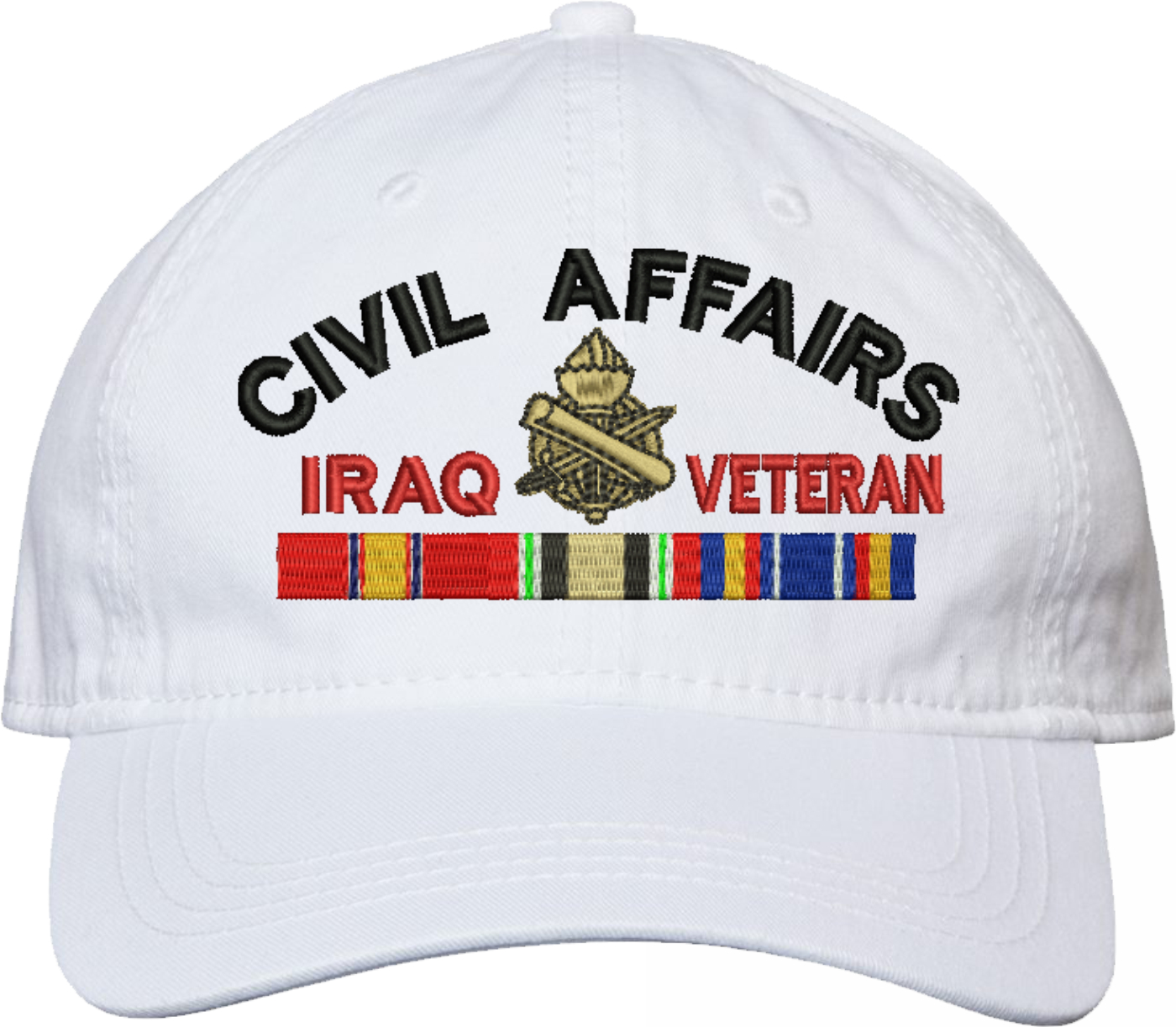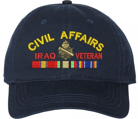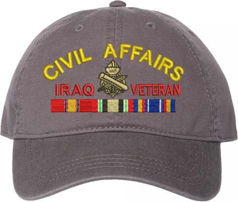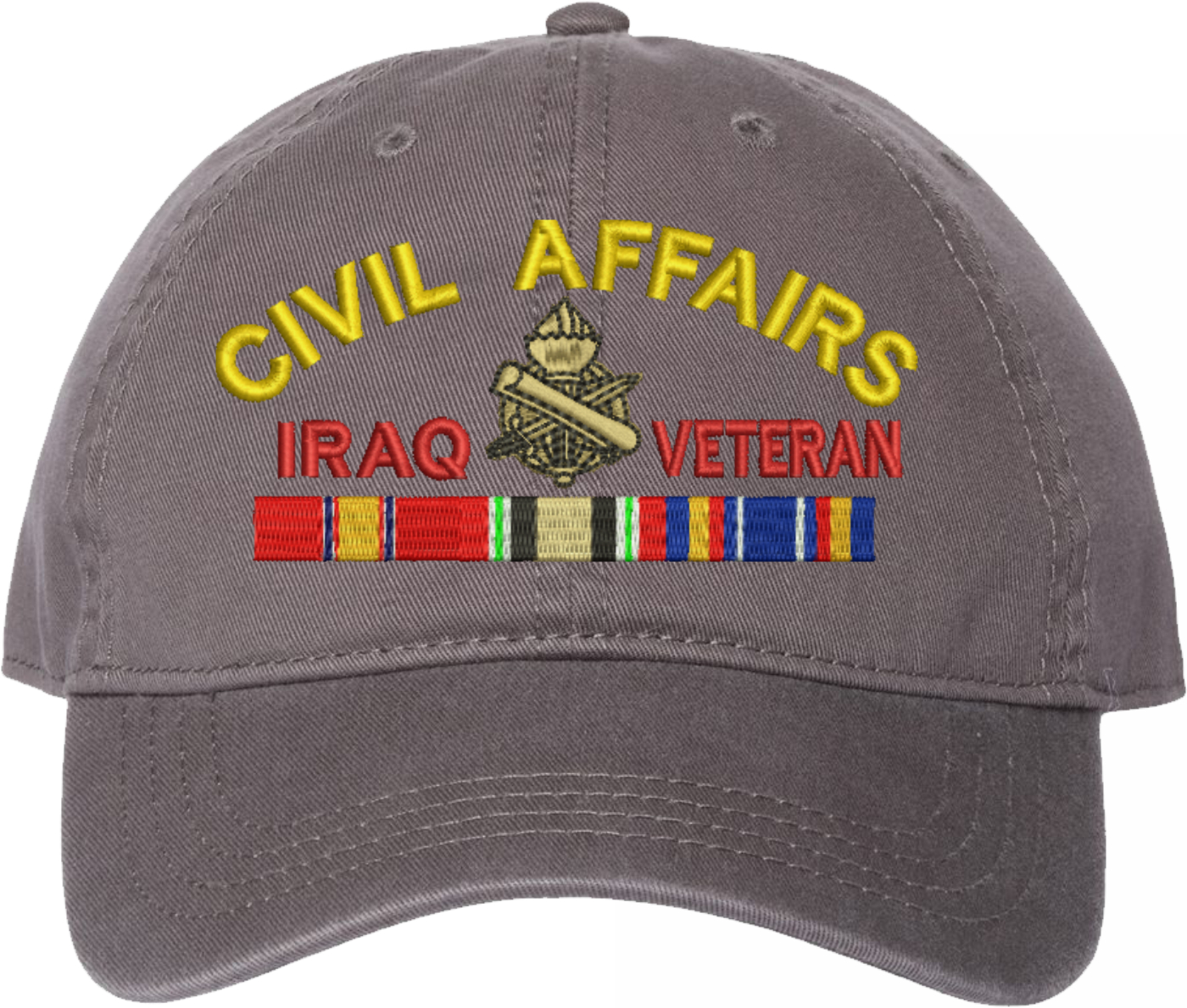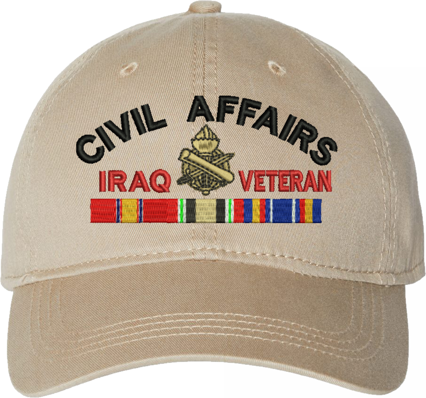 Show your Army pride with this U.S. Army Civil Affairs Iraq Veteran Unstructured Dad Cap from MilitaryBest. Crafted from 100% washed chino twill cotton, this six-panel, low-profile cap offers a relaxed and comfortable fit. Featuring high-quality embroidery done in our Scottsboro, Alabama facility, this cap is designed with a pre-curved visor and an adjustable tri-glide buckle closure for a perfect fit. Whether for everyday wear or as a meaningful gift, this cap is a great way to honor your own or a loved one's service.For caps ordered with custom embroidered personalized text please allow an additional 3 to 5 days production time. All custom back text will be embroidered in ALL CAPITAL LETTERS. Caps with back text or eggs are non-returnable unless there is a material defect in the cap.