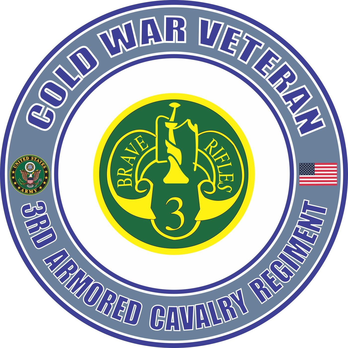 This U.S. Army Cold War 3rd Armored Cavalry Regiment Veteran Decal is Made in the USA at our facilities in Scottsboro, Alabama. Each U.S. Army Cold War 3rd Armored Cavalry Division Veteran Decal is made using the finest ink and vinyl available and all are made for outside applications. We have been producing high quality Military Decals for over 10 years and we guarantee the quality of each one. Choose from several sizes, and click the 'ADD TO CART' button. For bulk pricing for custom and wholesale decals click here: Custom & Wholesale Decals!*MilitaryBest customers use our decals on a variety of surfaces, however, their intended purpose is for windshield applications.