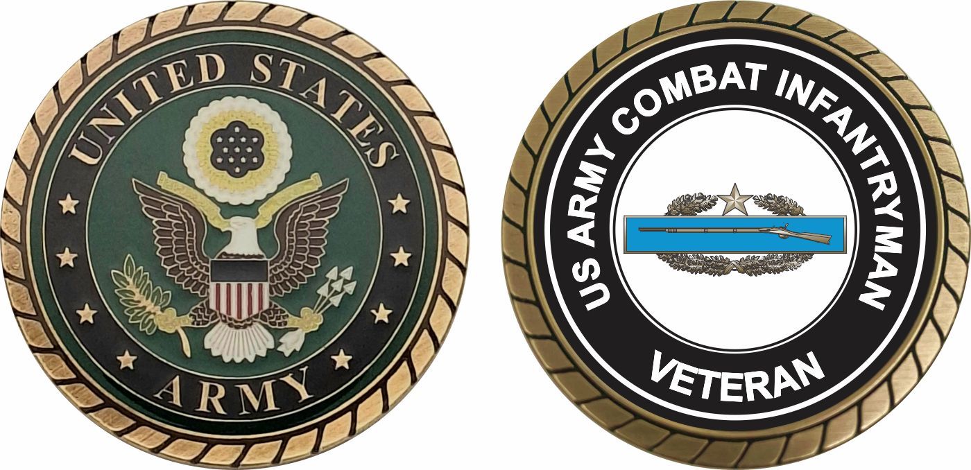 This 1 3/4” U.S. Army Combat Infantry 2nd Award Veteran Challenge Coin is proudly offered by MilitaryBest. This Officially Licensed Army coin has beautiful enamel finish on one side and an organized crisp clean U.S. Army Combat Infantry 2nd Award Veteran design on the opposite side.