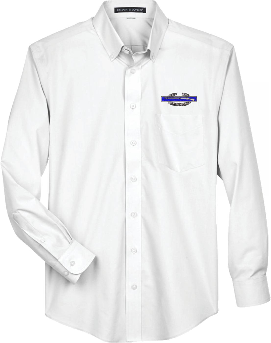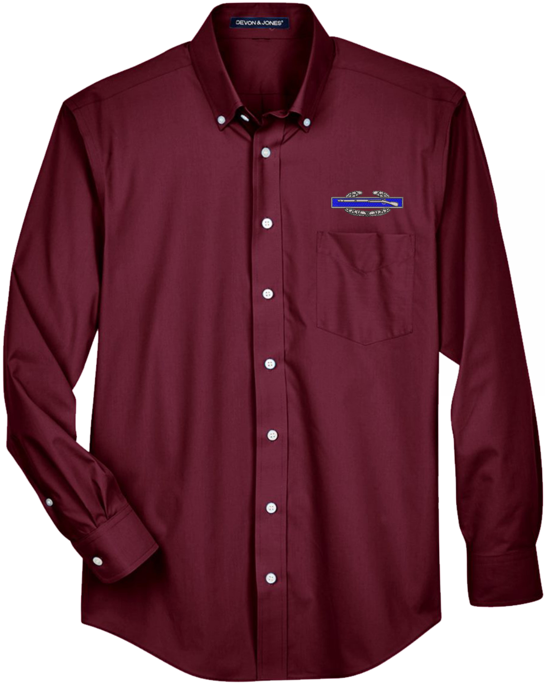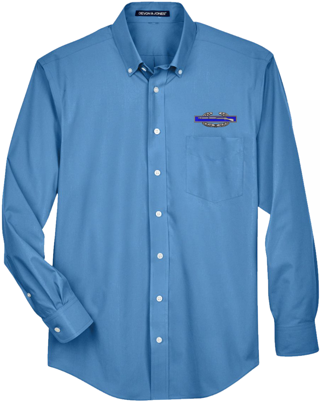 MilitaryBest has expanded its line of apparel with this U.S. Army Combat Infantry Badge Embroidered Dress Shirt. This long sleeve button down dress shirt is made using a stain-release, wrinkle-free, 55% cotton/45% polyester material. The pocket over the left chest measures 4 3/4" across. Featuring a U.S. Army Combat Infantry Badge design above the pocket, this shirt is embroidered to order at our facilities in Scottsboro, AL..- 55% cotton/45% polyester