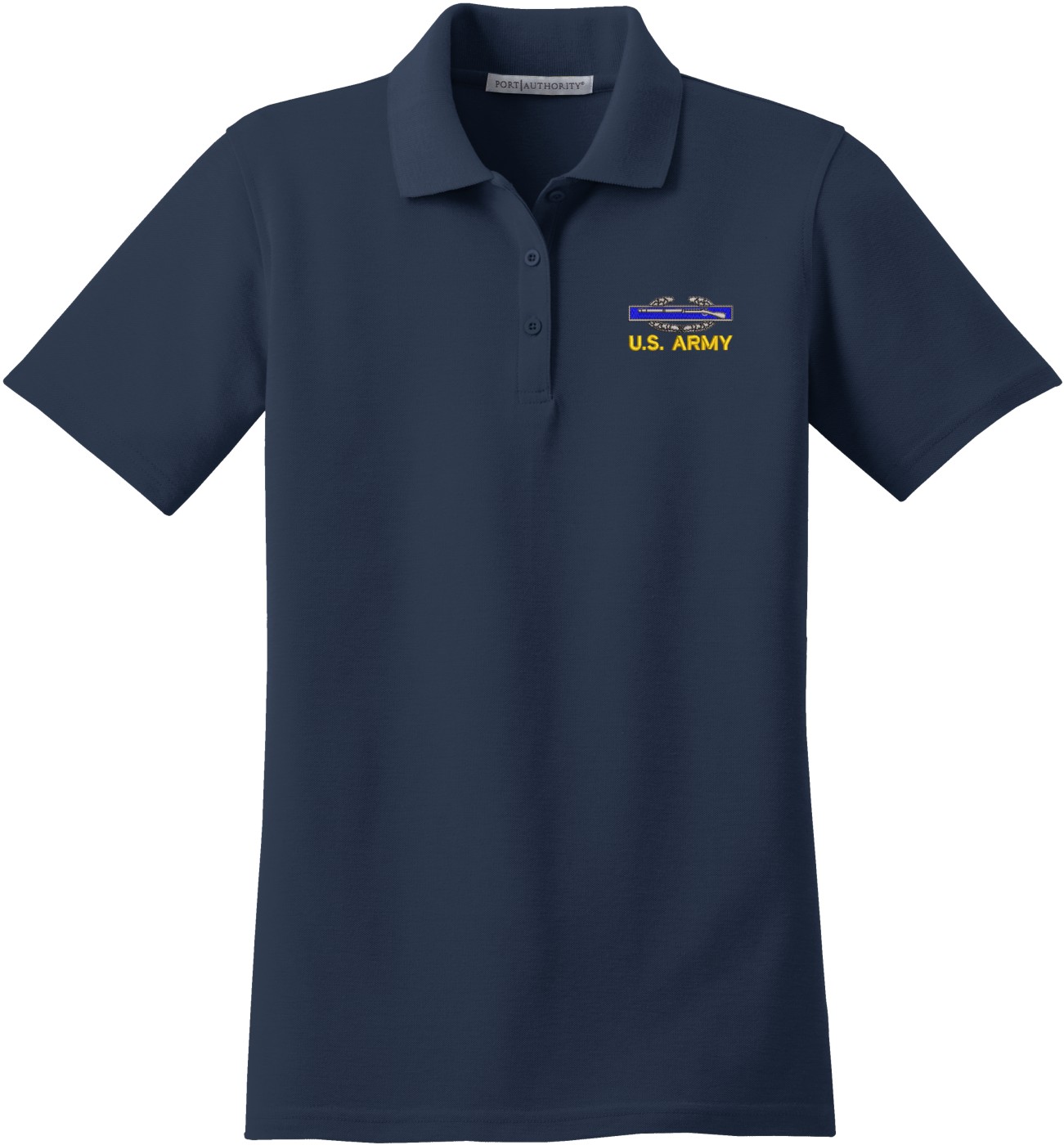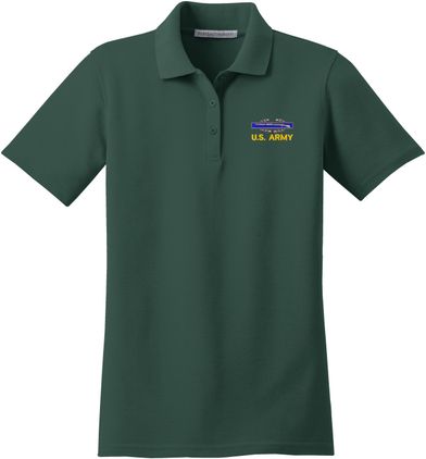 MilitaryBest is proud to offer this U.S. Army Combat Infantry Badge with Text Women's Stain-Release Polo. This polo is embroidered by our MilitaryBest team in Northeast Alabama. These polos are made with a stain-release finish for long-lasting wear, odor-fighting properties, and superior wrinkle and shrink resistance.Care Instructions: Machine Wash Cold With Like Colors. Do Not Use Fabric Softener. Do Not Bleach. Tumble Dry Low. Warm Iron If Necessary.