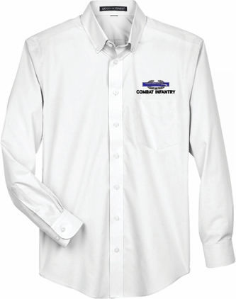 MilitaryBest has expanded its line of apparel with this U.S. Army Combat Infantry with CIB Embroidered Dress Shirt. This long sleeve button down dress shirt is made using a stain-release, wrinkle-free, 55% cotton/45% polyester material. The pocket over the left chest measures 4 3/4" across. Featuring a U.S. Army Combat Infantry with CIB design above the pocket, this shirt is embroidered to order at our facilities in Scottsboro, AL..- 55% cotton/45% polyester