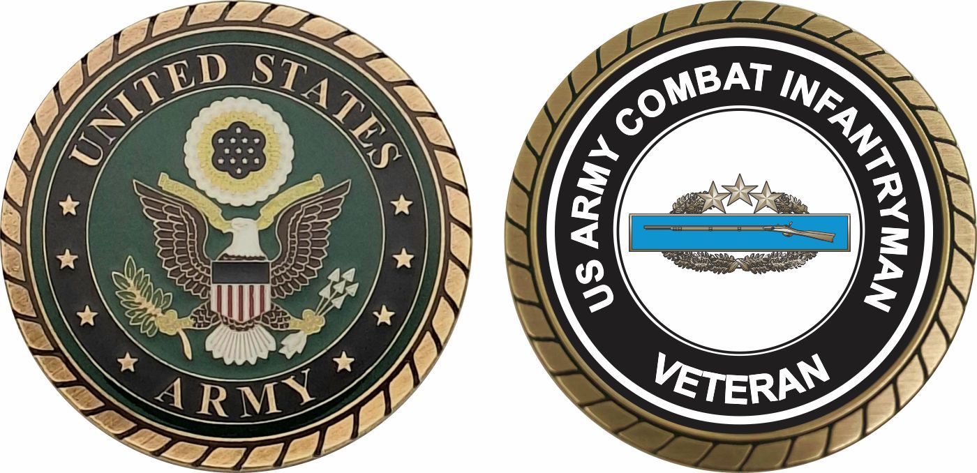 This 1 3/4” U.S. Army Combat Infantryman 4th Award Veteran Challenge Coin is proudly offered by MilitaryBest. This Officially Licensed Army coin has beautiful enamel finish on one side and an organized crisp clean U.S. Army Combat Infantryman 4th Award Veteran design on the opposite side.