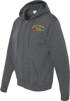 MilitaryBest has expanded its line of apparel with this custom embroidered U.S. Army Corps of Engineers Vietnam Veteran Zippered Hoodie. Each Hoodie is direct embroidered onto a Champion brand 9.5 oz 50/50 Cotton Poly blend. This will make an excellent addition to your wardrobe, or a great gift. Your satisfaction is Guaranteed! These quality zippered hoodies are proudly embroidered at our facilities in Scottsboro, AL. Support the Army MWR program by purchasing only from Licensed Vendors. To all of our Vietnam Veterans, Welcome Home!