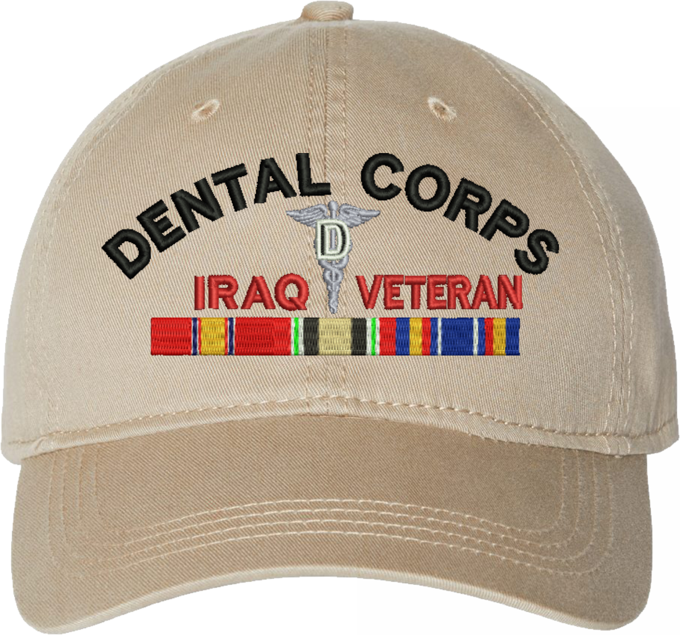 Show your Army pride with this U.S. Army Dental Corps Iraq Veteran Unstructured Dad Cap from MilitaryBest. Crafted from 100% washed chino twill cotton, this six-panel, low-profile cap offers a relaxed and comfortable fit. Featuring high-quality embroidery done in our Scottsboro, Alabama facility, this cap is designed with a pre-curved visor and an adjustable tri-glide buckle closure for a perfect fit. Whether for everyday wear or as a meaningful gift, this cap is a great way to honor your own or a loved one's service.For caps ordered with custom embroidered personalized text please allow an additional 3 to 5 days production time. All custom back text will be embroidered in ALL CAPITAL LETTERS. Caps with back text or eggs are non-returnable unless there is a material defect in the cap.