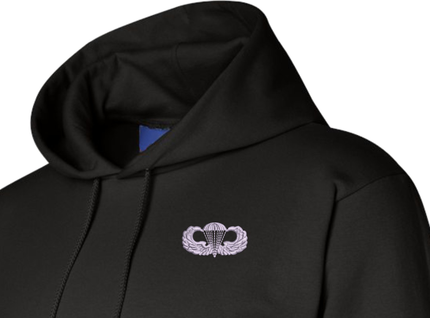 MilitaryBest has expanded its line of apparel with this custom embroidered U.S. Army Jump Wings Hoodie. Each Hoodie is direct embroidered onto a Champion brand 9.5 oz 50/50 Cotton Poly blend. This U.S. Army Jump Wings Hoodie will make an excellent addition to your wardrobe, or a great gift. Your satisfaction is Guaranteed! This U.S. Army Jump Wings Hoodie is custom embroidered at our facilities in Scottsboro, AL.