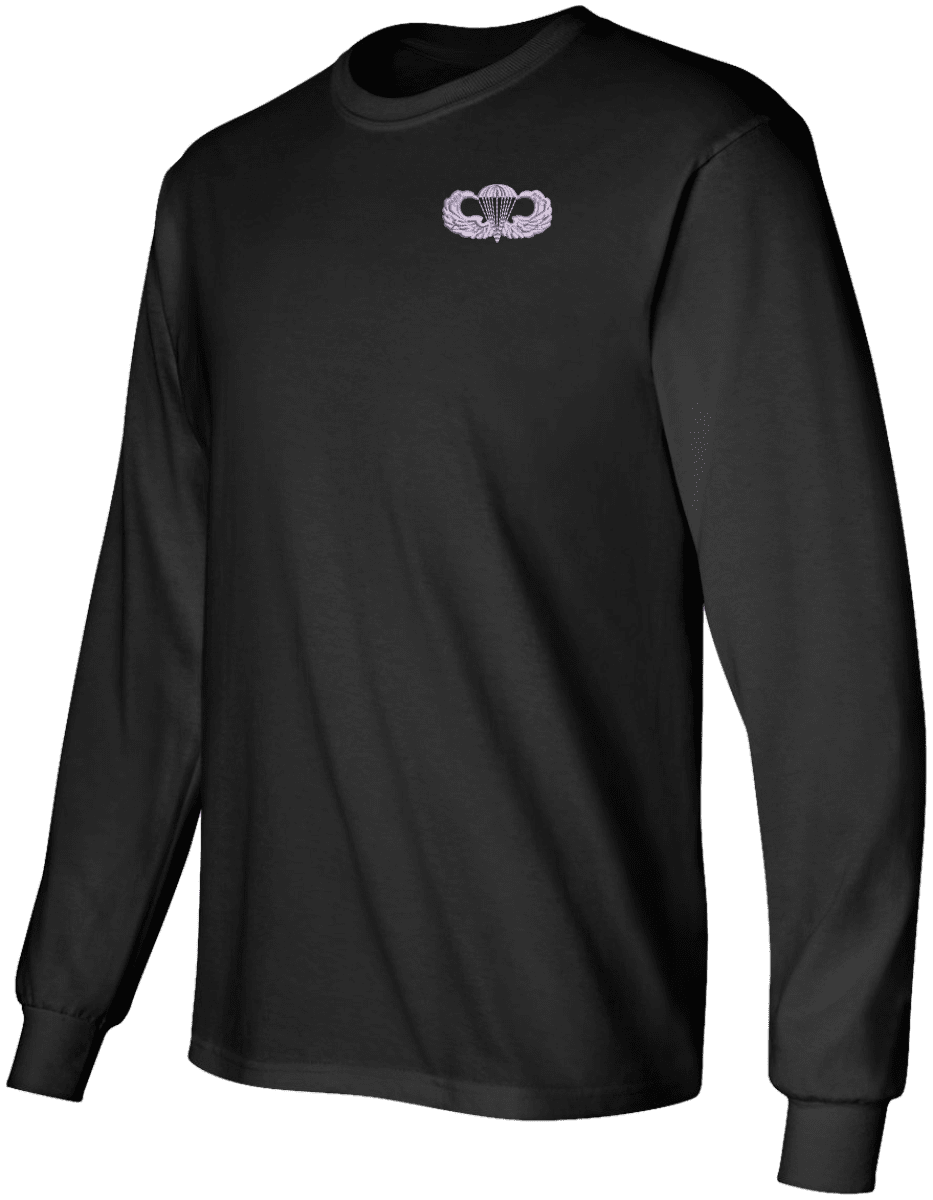 MilitaryBest has expanded its line of apparel with this custom embroidered U.S. Army Jump Wings Long Sleeve T-Shirt. This Gildan brand long sleeve t-shirt is made using a 6 oz pre-shrunk 100% cotton material. This U.S. Army Jump Wings Long Sleeve T-Shirt will make an excellent addition to your wardrobe or a quality gift. This U.S. Army Jump Wings Long Sleeve T-Shirt is custom embroidered at our facilities in Scottsboro, Alabama.