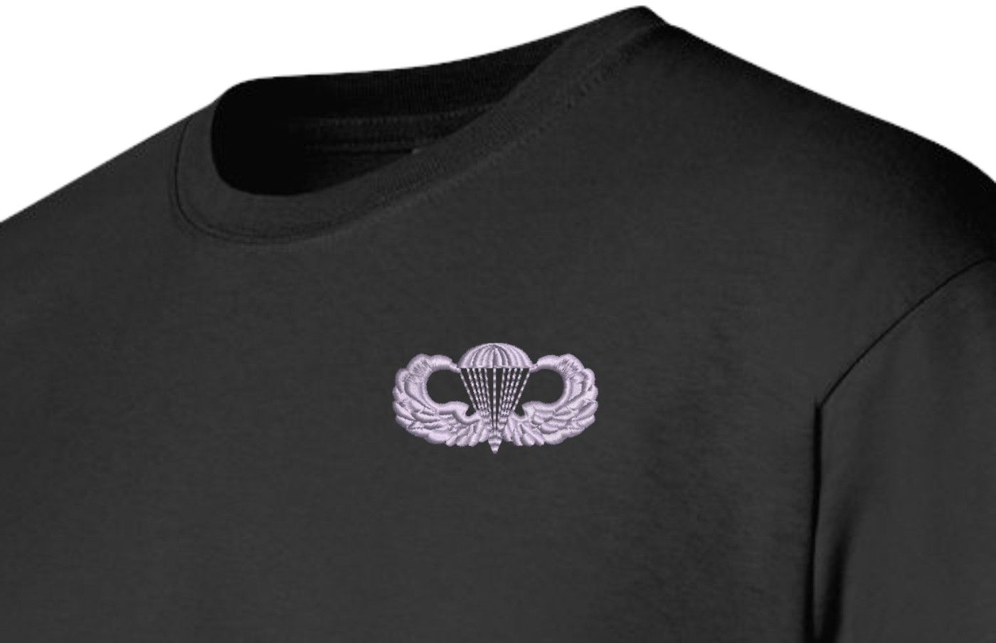 Note: Some of the Color Options pictured may not be available. Available Color Options are listed on the drop down menu above.MilitaryBest has expanded its line of apparel with this custom embroidered U.S. Army Jump Wings Long Sleeve T-Shirt. This Gildan brand long sleeve t-shirt is made using a 6 oz pre-shrunk 100% cotton material. This U.S. Army Jump Wings Long Sleeve T-Shirt will make an excellent addition to your wardrobe or a quality gift. This U.S. Army Jump Wings Long Sleeve T-Shirt is custom embroidered at our facilities in Scottsboro, Alabama.