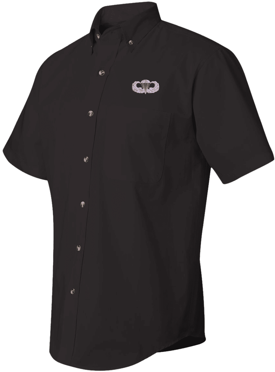 We are selling out of our remaining inventory of this discontinued item at a limited supply.MilitaryBest has expanded its line of apparel with this custom embroidered U.S. Army Jump Wings Short Sleeve Dress Shirt. This Featherlite brand short sleeve button down dress shirt is made using a stain-resistant 60/40 cotton/polyester twill material. This U.S. Army Jump Wings Short Sleeve Dress Shirt will make an excellent addition to your wardrobe or a quality gift. This U.S. Army Jump Wings Short Sleeve Dress Shirt is custom embroidered at our facilities in Scottsboro, Alabama.