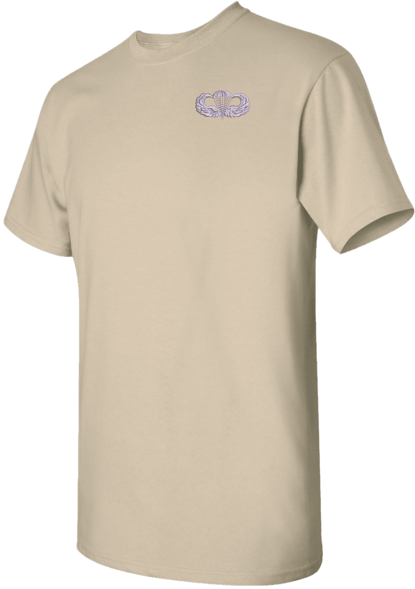 MilitaryBest is expanding its line of apparel with this fine U.S. Army Jump Wings T-Shirt. This Gildan brand short sleeve t-shirt is made using a 6 oz pre-shrunk 100% cotton material. This U.S. Army Jump Wings T-Shirt will make an excellent addition to your wardrobe or a fine gift. This U.S. Army Jump Wings T-Shirt is custom embroidered at our facilities in Scottsboro, AL when you place your order.