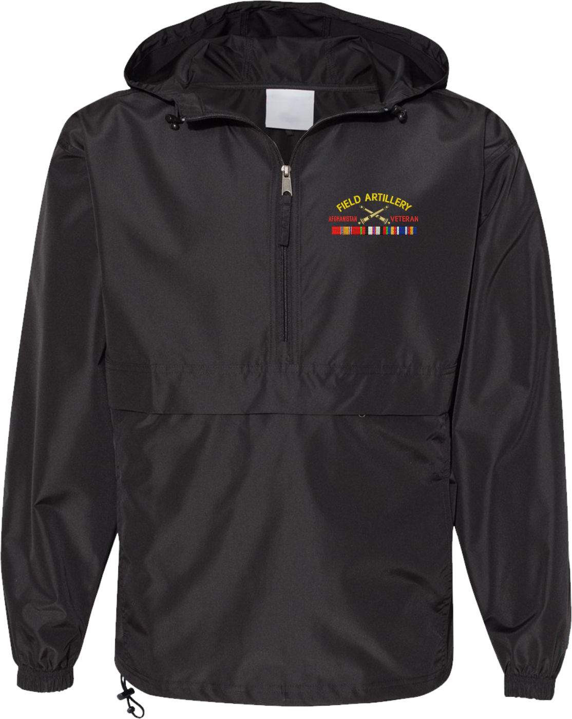 MilitaryBest is proud to offer this quality U.S. Army Field Artillery Afghanistan Veteran Hooded Windbreaker. Also known as an Anorak Jacket, this windbreaker is designed to keep wind and water out. With a design embroidered over the left chest, this windbreaker is embroidered to order at our facilities in Scottsboro, AL.. This windbreaker can be packed into the mesh lined pouch pocket for a more portable method of storage.- 100% Polyester