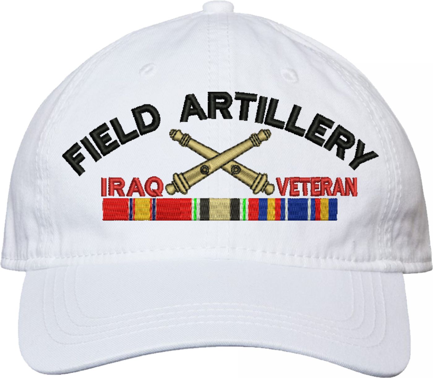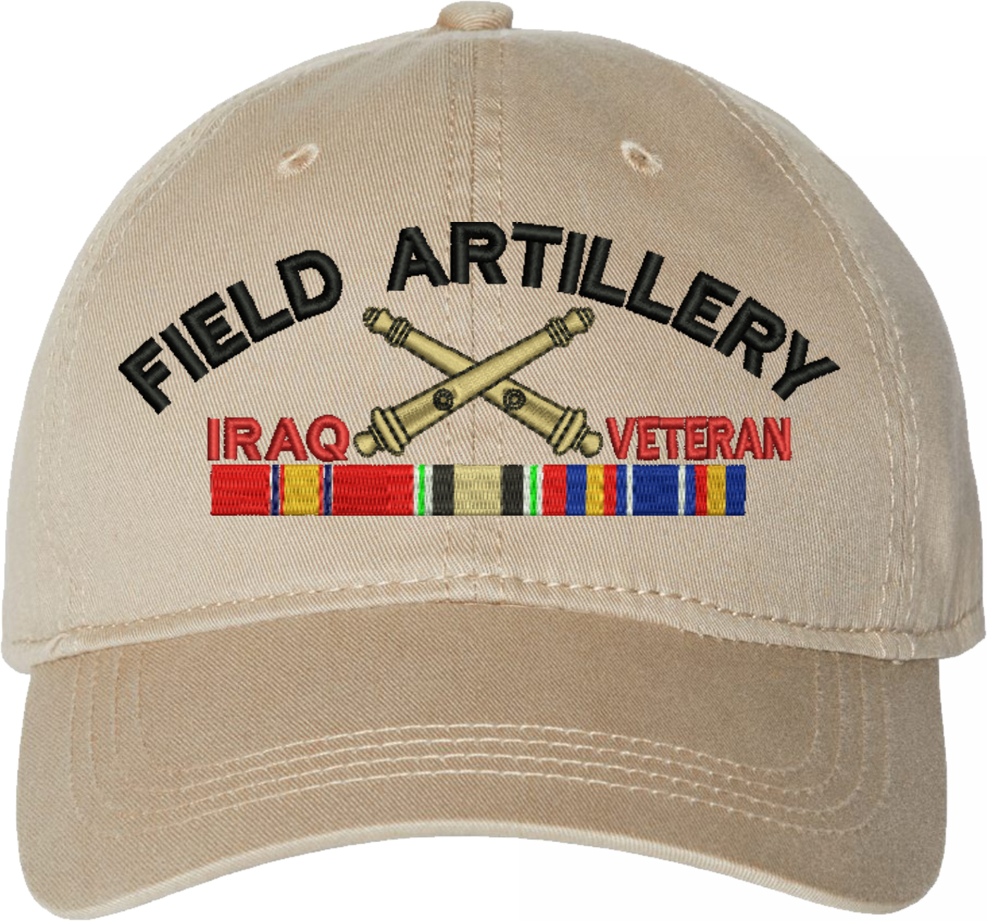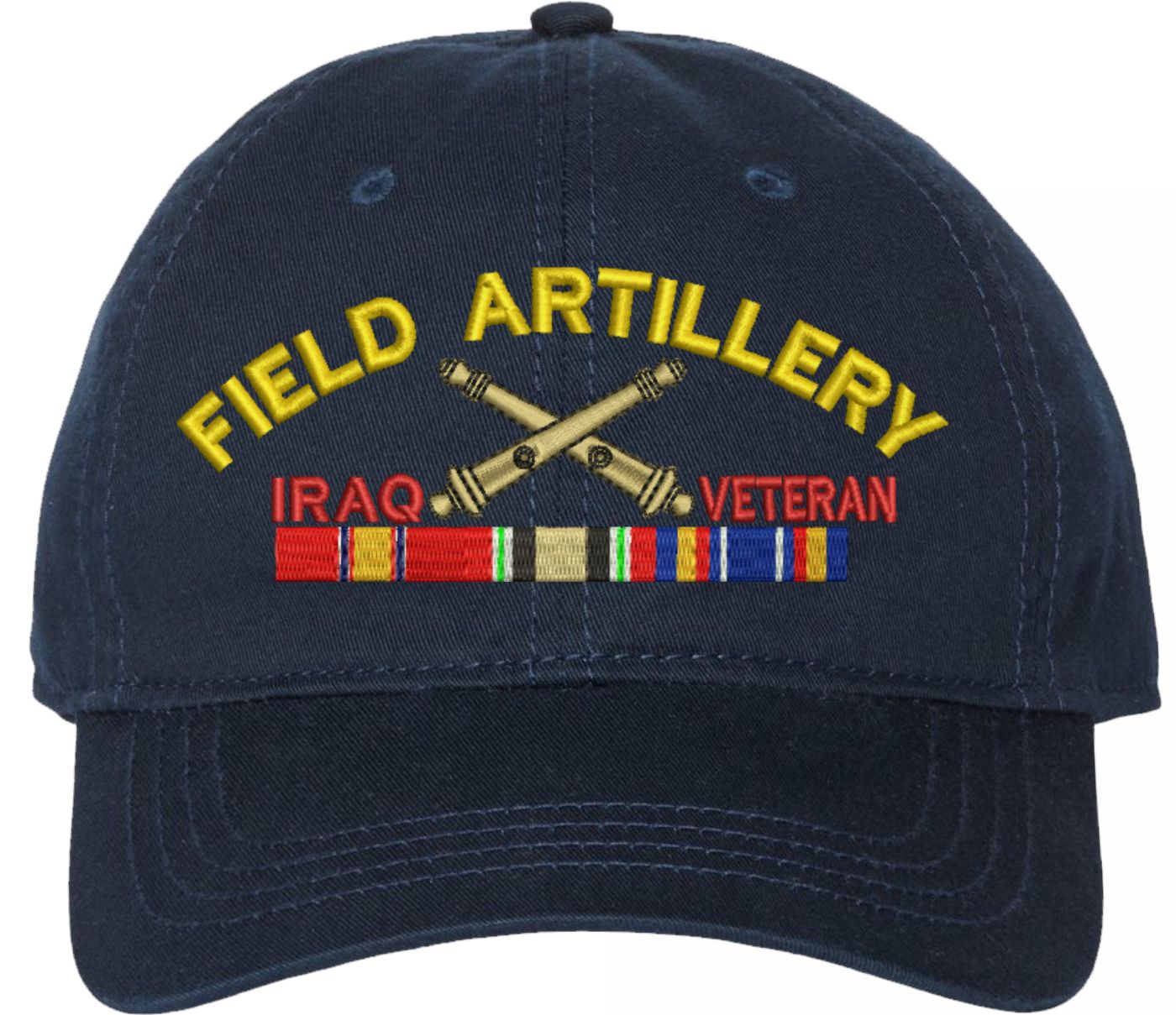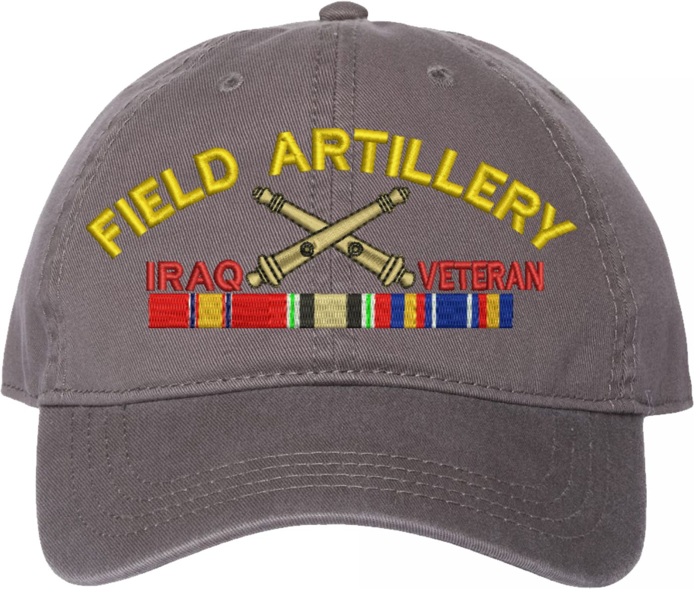 Show your Army pride with this U.S. Army Field Artillery Iraq Veteran Unstructured Dad Cap from MilitaryBest. Crafted from 100% washed chino twill cotton, this six-panel, low-profile cap offers a relaxed and comfortable fit. Featuring high-quality embroidery done in our Scottsboro, Alabama facility, this cap is designed with a pre-curved visor and an adjustable tri-glide buckle closure for a perfect fit. Whether for everyday wear or as a meaningful gift, this cap is a great way to honor your own or a loved one's service.For caps ordered with custom embroidered personalized text please allow an additional 3 to 5 days production time. All custom back text will be embroidered in ALL CAPITAL LETTERS. Caps with back text or eggs are non-returnable unless there is a material defect in the cap.