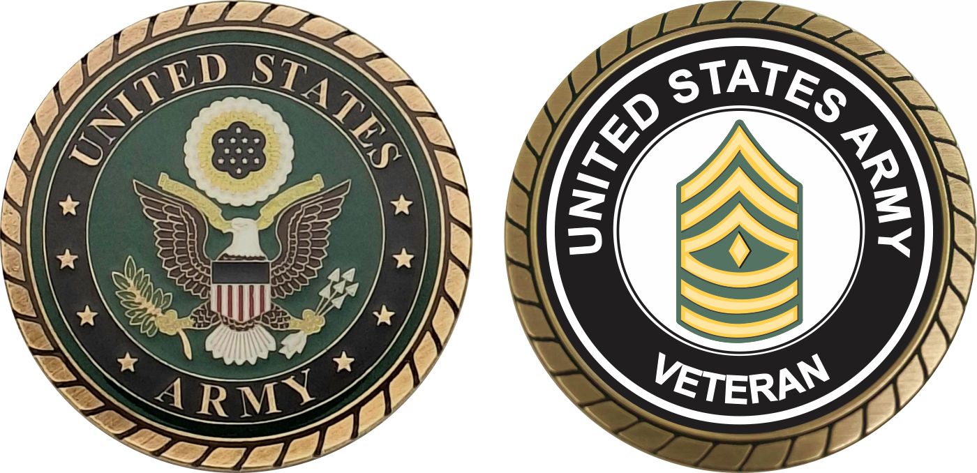 This 1 3/4” U.S. Army First Sergeant Veteran Challenge Coin is proudly offered by MilitaryBest. This Officially Licensed Army coin has beautiful enamel finish on one side and an organized crisp clean U.S. Army First Sergeant Veteran design on the opposite side.
