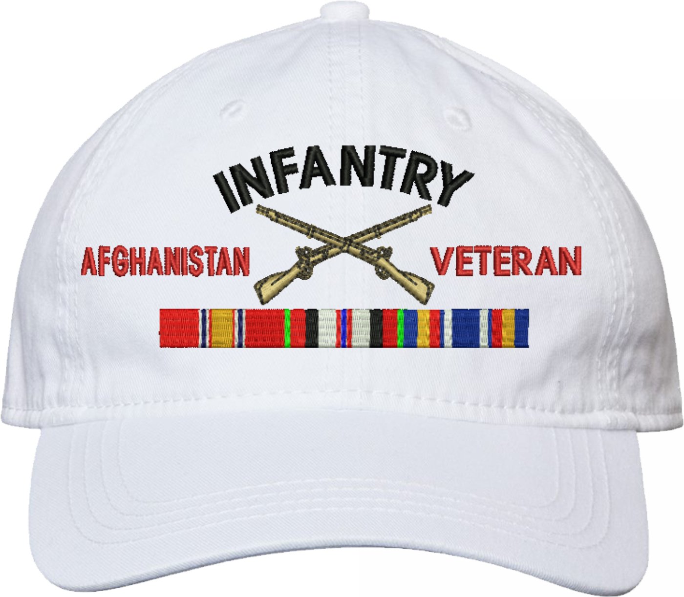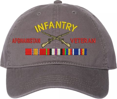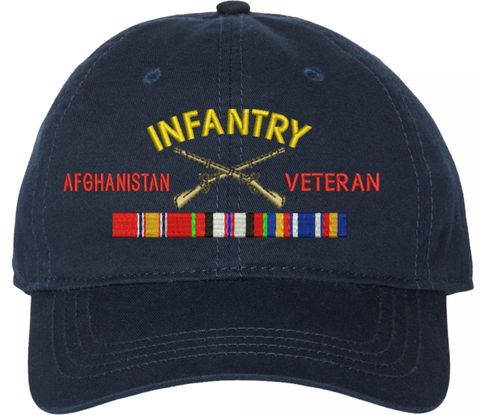 Show your Army pride with this U.S. Army Infantry Afghanistan Veteran Unstructured Dad Cap from MilitaryBest. Crafted from 100% washed chino twill cotton, this six-panel, low-profile cap offers a relaxed and comfortable fit. Featuring high-quality embroidery done in our Scottsboro, Alabama facility, this cap is designed with a pre-curved visor and an adjustable tri-glide buckle closure for a perfect fit. Whether for everyday wear or as a meaningful gift, this cap is a great way to honor your own or a loved one's service.For caps ordered with custom embroidered personalized text please allow an additional 3 to 5 days production time. All custom back text will be embroidered in ALL CAPITAL LETTERS. Caps with back text or eggs are non-returnable unless there is a material defect in the cap.