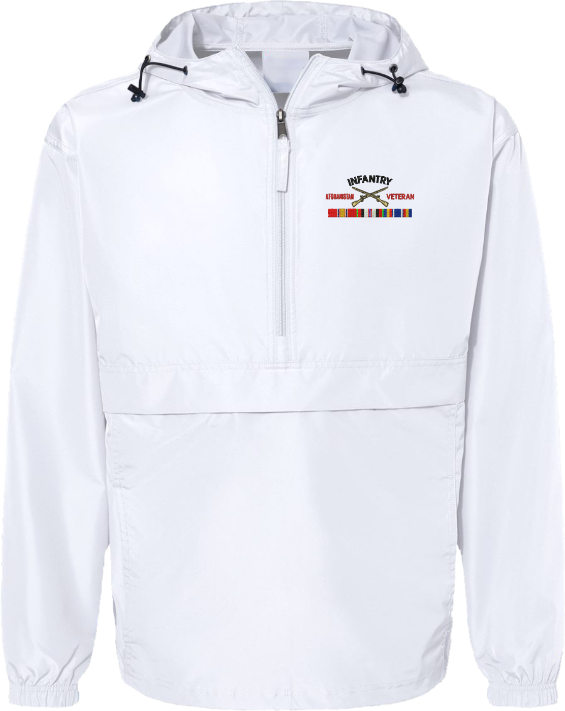 MilitaryBest is proud to offer this quality U.S. Army Infantry Afghanistan Veteran Hooded Windbreaker. Also known as an Anorak Jacket, this windbreaker is designed to keep wind and water out. With a design embroidered over the left chest, this windbreaker is embroidered to order at our facilities in Scottsboro, AL.. This windbreaker can be packed into the mesh lined pouch pocket for a more portable method of storage.- 100% Polyester