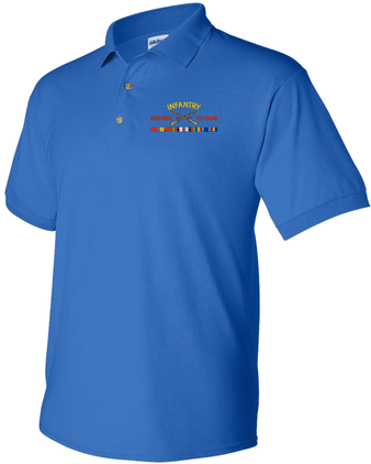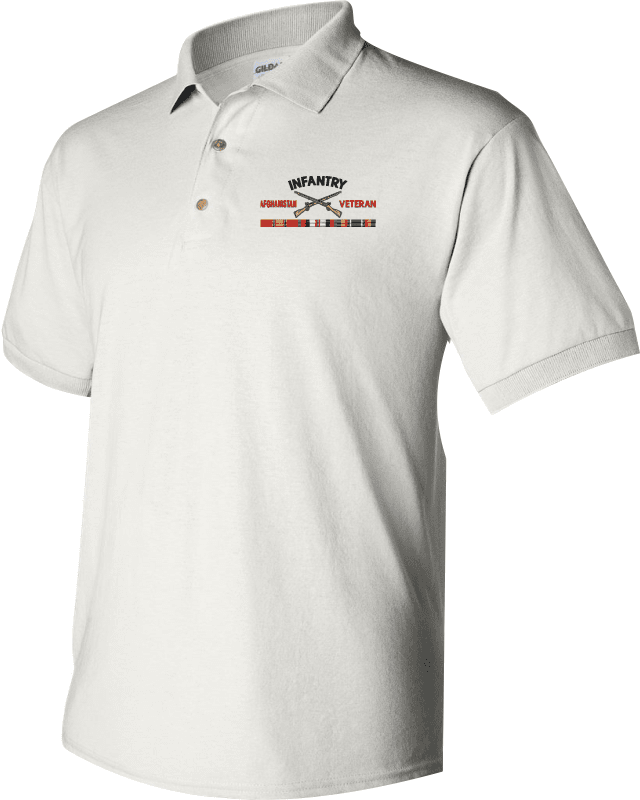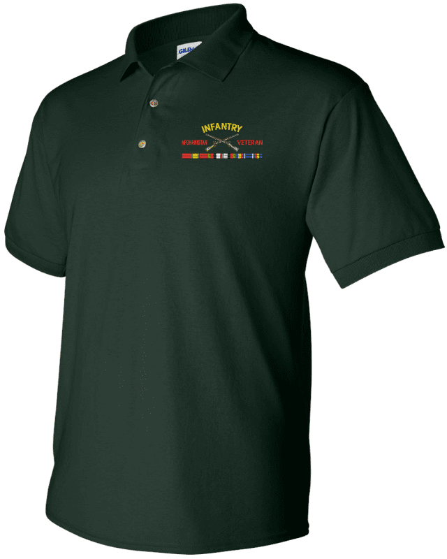 MilitaryBest is proud to offer this quality U.S. Army Infantry Afghanistan Veteran Polo. Each Polo is available in either 100% Ringspun cotton pique or a 50/50 cotton/polyester blend. These quality Military Polos are proudly embroidered at our facilities in Scottsboro, AL. Support the Army MWR program by purchasing only from Licensed Vendors.