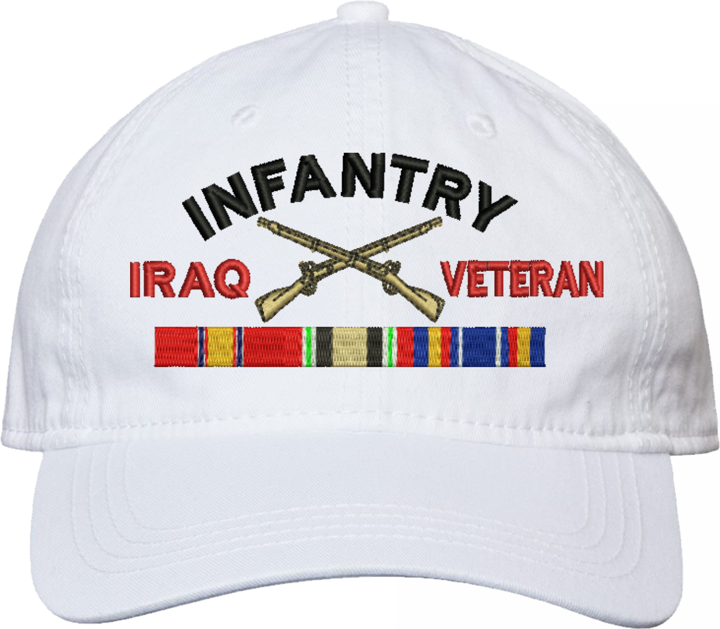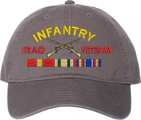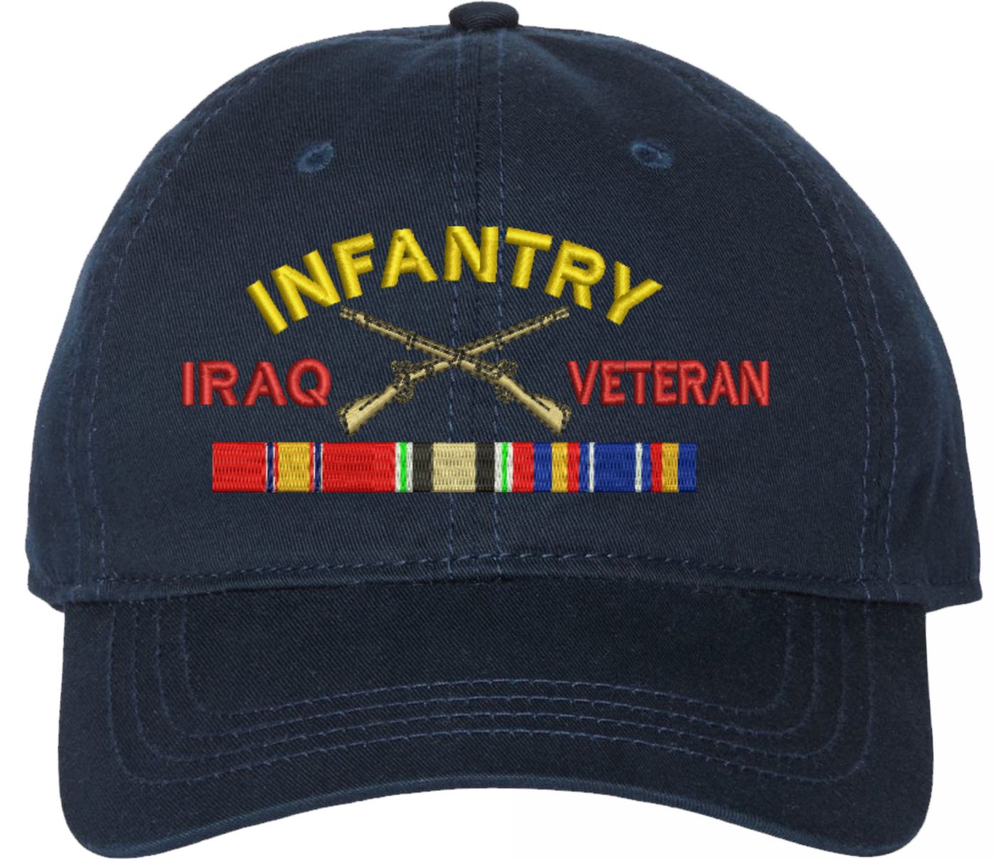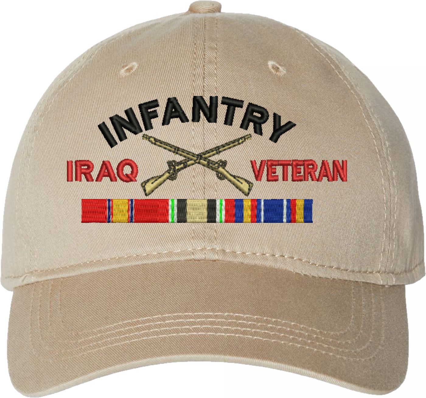 Show your Army pride with this U.S. Army Infantry Iraq Veteran Unstructured Dad Cap from MilitaryBest. Crafted from 100% washed chino twill cotton, this six-panel, low-profile cap offers a relaxed and comfortable fit. Featuring high-quality embroidery done in our Scottsboro, Alabama facility, this cap is designed with a pre-curved visor and an adjustable tri-glide buckle closure for a perfect fit. Whether for everyday wear or as a meaningful gift, this cap is a great way to honor your own or a loved one's service.For caps ordered with custom embroidered personalized text please allow an additional 3 to 5 days production time. All custom back text will be embroidered in ALL CAPITAL LETTERS. Caps with back text or eggs are non-returnable unless there is a material defect in the cap.