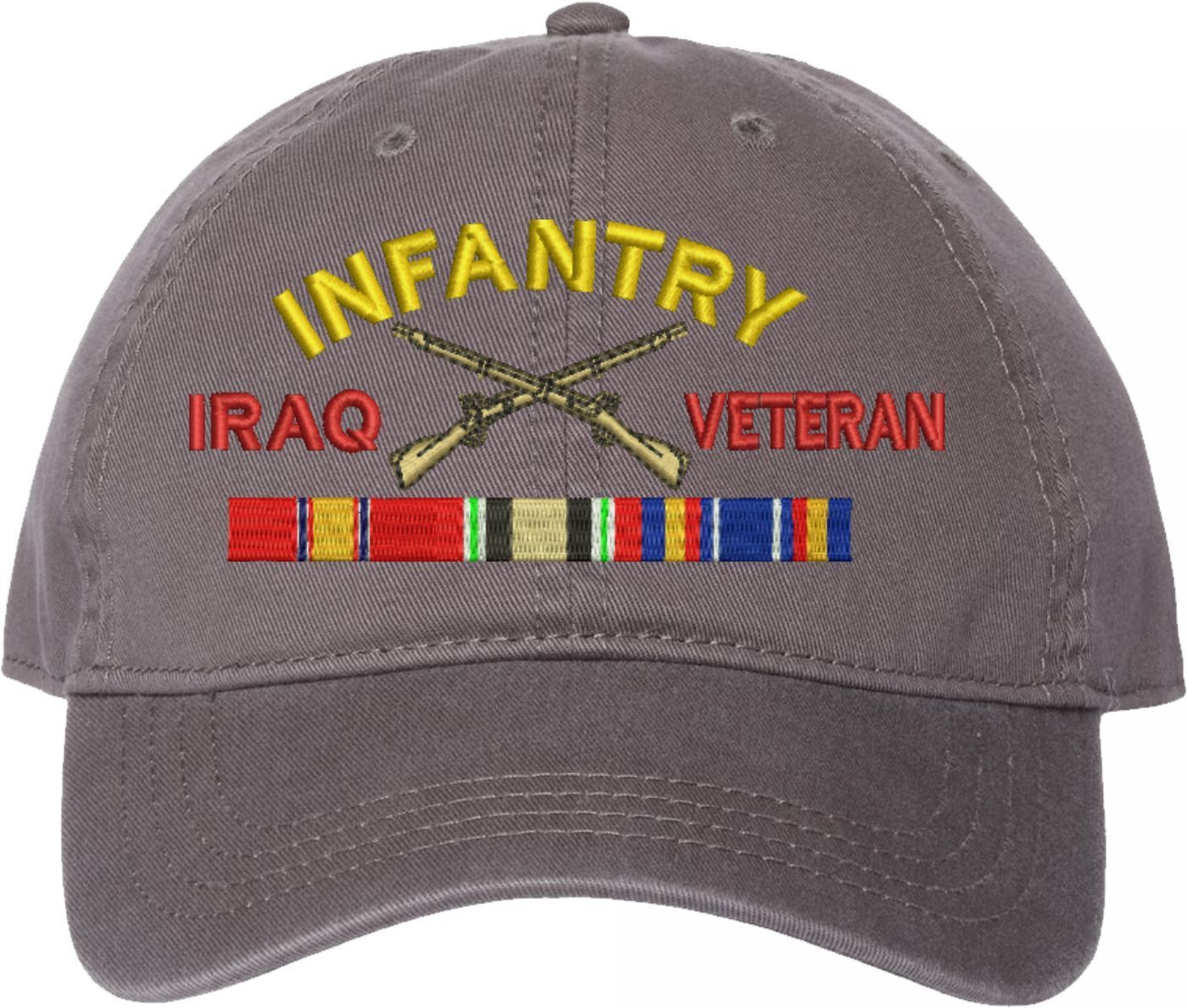 This U.S. Army Infantry Iraq Veteran Charcoal Dad Cap is an overstock item and is only available for the value price while supplies last. Clearance Items are not eligible for Refunds or Returns,A percentage of the sale of each MilitaryBest item is forwarded to the licensing departments of each respective branch of service in support of the MWR (Morale, Welfare, & Recreation) program. These payments are made by either ALL4U LLC or the wholesaler from where the item originated. Our team thanks you for your service and your support of these programs.