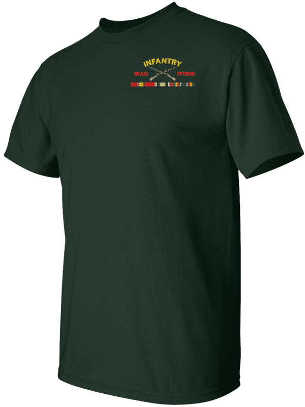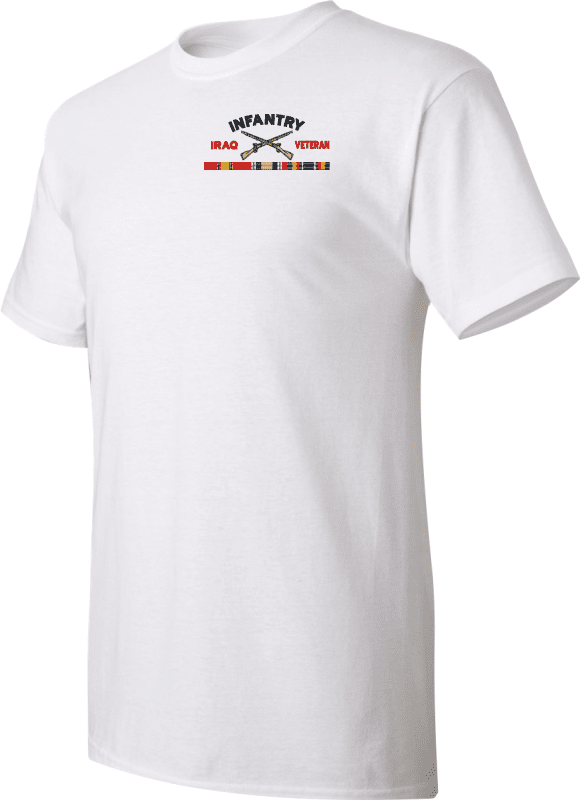 Note: Some of the Color Options pictured may not be available. Available Color Options are listed on the drop down menu above. Yellow colored text is embroidered in black on Khaki Tan and White shirts.MilitaryBest is proud to offer this U.S. Army Infantry Iraq Veteran T-Shirt. These quality Military T-Shirts are proudly embroidered at our facilities in Scottsboro, AL. Support the Army MWR program by purchasing only from Licensed Vendors.