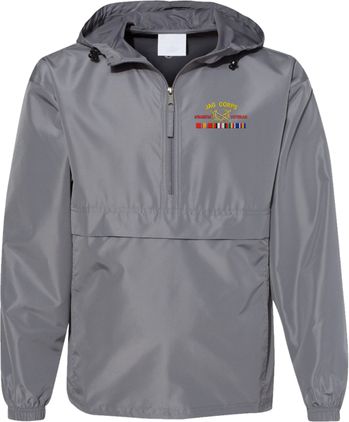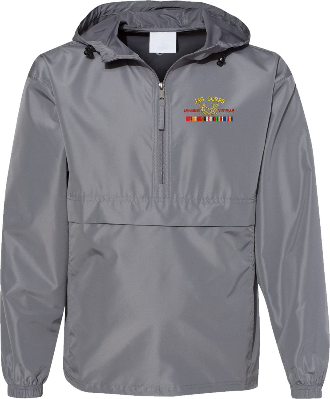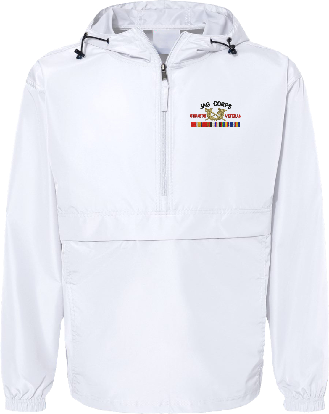 MilitaryBest is proud to offer this quality U.S. Army Judge Advocate General's Corps Afghanistan Veteran Hooded Windbreaker. Also known as an Anorak Jacket, this windbreaker is designed to keep wind and water out. With a design embroidered over the left chest, this windbreaker is embroidered to order at our facilities in Scottsboro, AL.. This windbreaker can be packed into the mesh lined pouch pocket for a more portable method of storage.- 100% Polyester