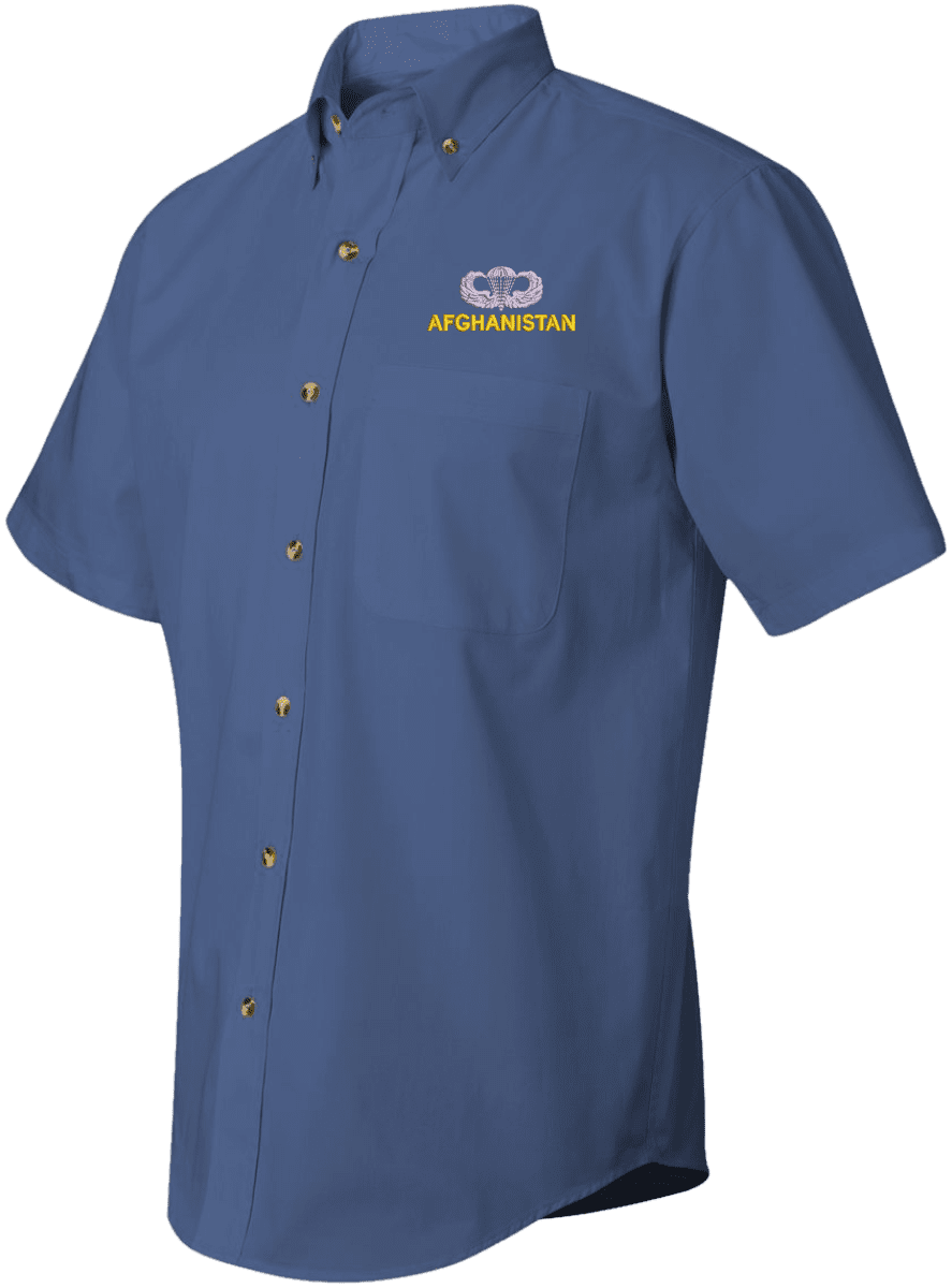 We are selling out of our remaining inventory of this discontinued item at a limited supply.MilitaryBest has expanded its line of apparel with this custom embroidered U.S. Army Afghanistan Jump Wings Short Sleeve Dress Shirt. This Featherlite brand short sleeve button down dress shirt is made using a stain-resistant 60/40 cotton/polyester twill material. This U.S. Army Afghanistan Jump Wings Short Sleeve Dress Shirt will make an excellent addition to your wardrobe or a quality gift. This U.S. Army Afghanistan Jump Wings Short Sleeve Dress Shirt is custom embroidered at our facilities in Scottsboro, Alabama.
