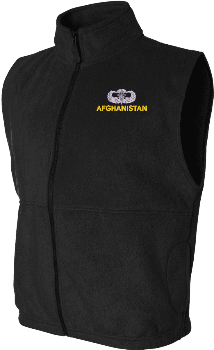 Due to supply chain disruptions, some colors and sizes may not be available in the same Brand, in these cases a brand of comparable quality will be used. Feel free to call in advance of your order, with questions you may have.MilitaryBest is expanding its line of Men's apparel with this quality U.S. Army Afghanistan Jump Wings Full-Zip Fleece Vest. This U.S. Army Afghanistan Jump Wings Full-Zip Fleece Vest features a convertible collar with dyed-to-match zipper pull, oversized nylon reinforced slash pockets, and an elastic hem. It is made using a 100% anti-pill polyester Fleece Vest. This U.S. Army Afghanistan Jump Wings Full-Zip Fleece Vest will make an excellent addition to your wardrobe, or a quality gift. Your satisfaction is guaranteed! These Vests are custom embroidered at our facilities in Scottsboro, AL.