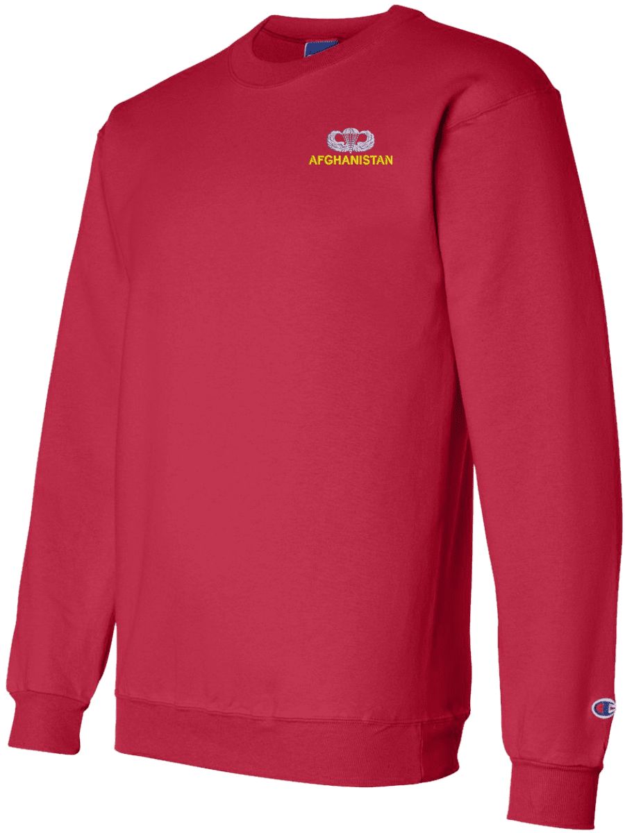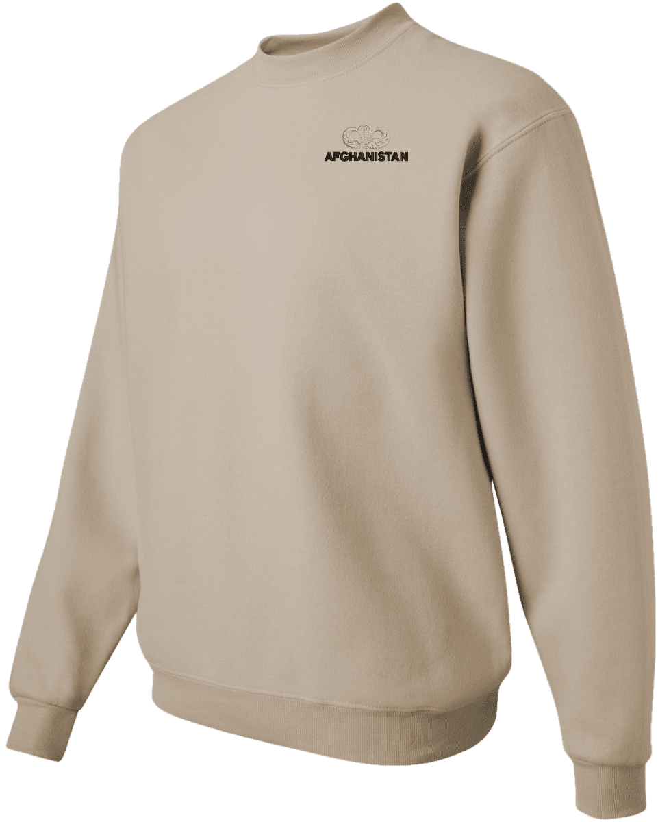 MilitaryBest has expanded its line of apparel with this custom embroidered U.S. Army Afghanistan Jump Wings Sweatshirt. Each sweatshirt is direct embroidered onto either a Champion or Jerzees brand sweatshirt using a 9.5 oz 50/50 Cotton Poly blend material. This U.S. Army Afghanistan Jump Wings Sweatshirt will make an excellent addition to your wardrobe, or a great gift. Your satisfaction is Guaranteed! This U.S. Army Afghanistan Jump Wings Sweatshirt is custom embroidered at our facilities in Scottsboro, AL.