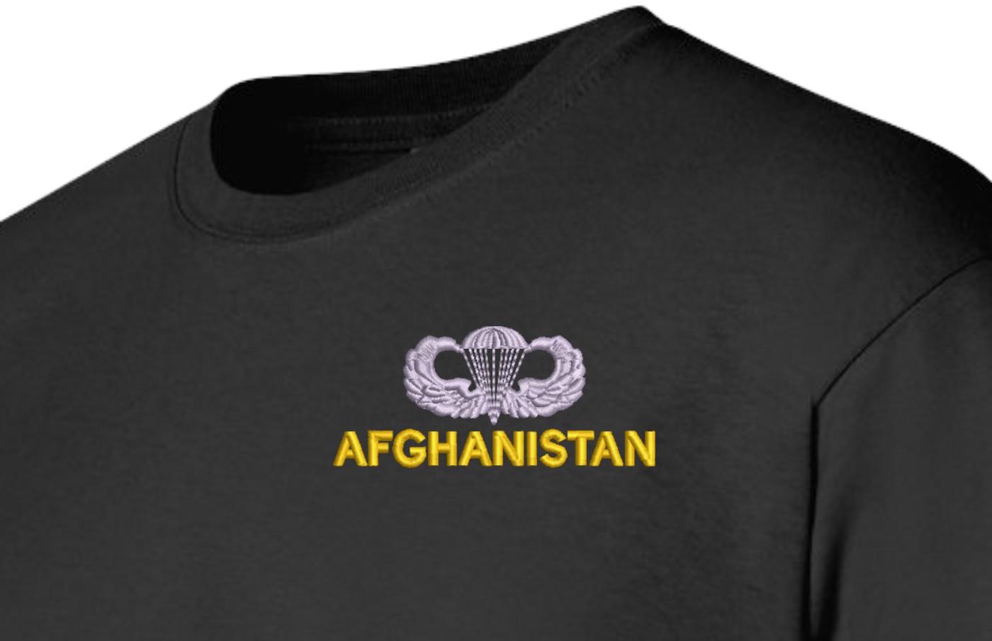 Note: Some of the Color Options pictured may not be available. Available Color Options are listed on the drop down menu above.MilitaryBest is expanding its line of apparel with this fine U.S. Army Afghanistan Jump Wings T-Shirt. This Gildan brand short sleeve t-shirt is made using a 6 oz pre-shrunk 100% cotton material. This U.S. Army Afghanistan Jump Wings T-Shirt will make an excellent addition to your wardrobe or a fine gift. This U.S. Army Afghanistan Jump Wings T-Shirt is custom embroidered at our facilities in Scottsboro, AL when you place your order.