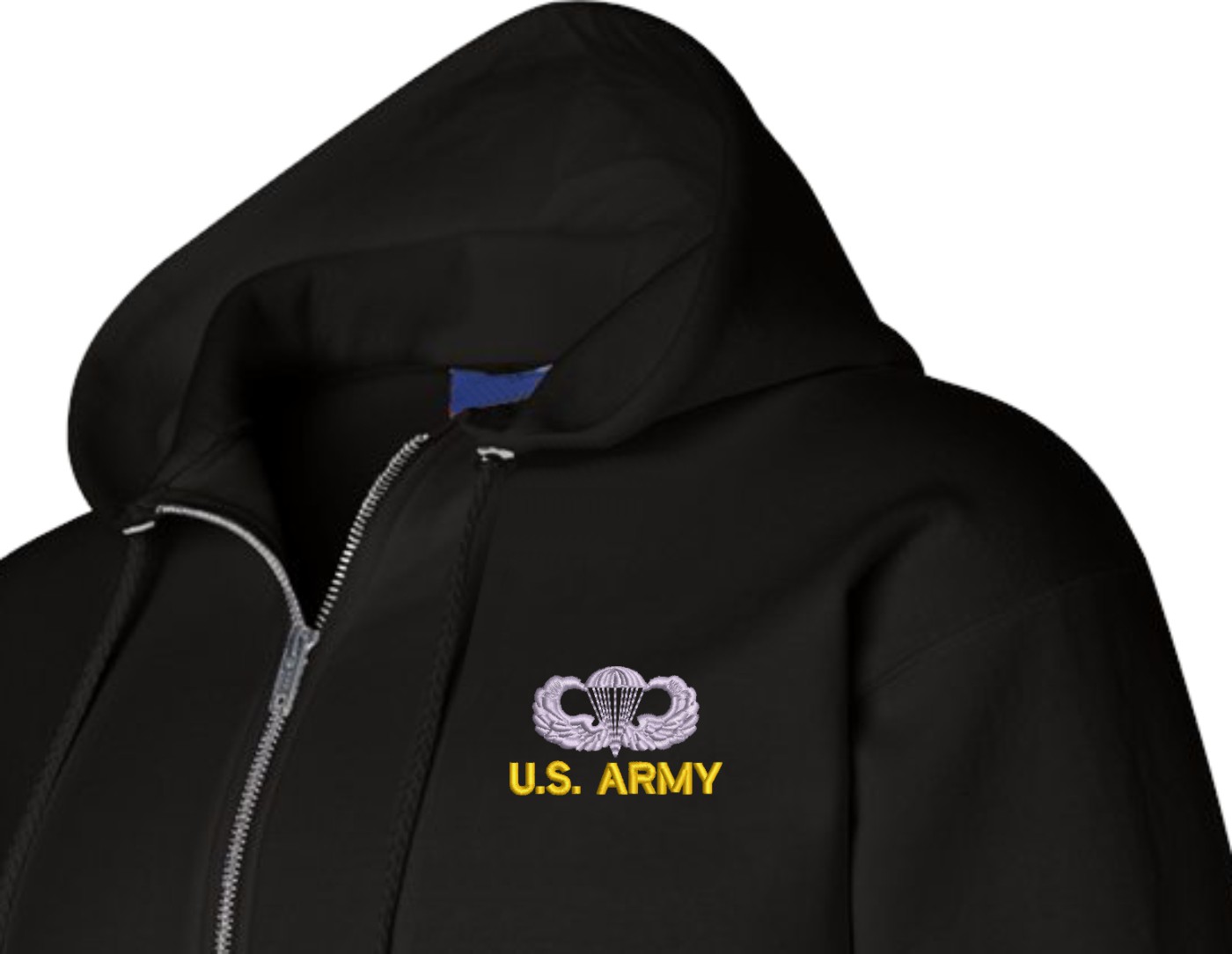 MilitaryBest has expanded its line of apparel with this custom embroidered U.S. Army Jump Wings Full Zip Hoodie. Each Hoodie is direct embroidered onto a Champion brand 9.5 oz 50/50 Cotton Poly blend. This U.S. Army Jump Wings Full Zip Hoodie will make an excellent addition to your wardrobe, or a great gift. Your satisfaction is Guaranteed! This U.S. Army Jump Wings Full Zip Hoodie is custom embroidered at our facilities in Scottsboro, AL.