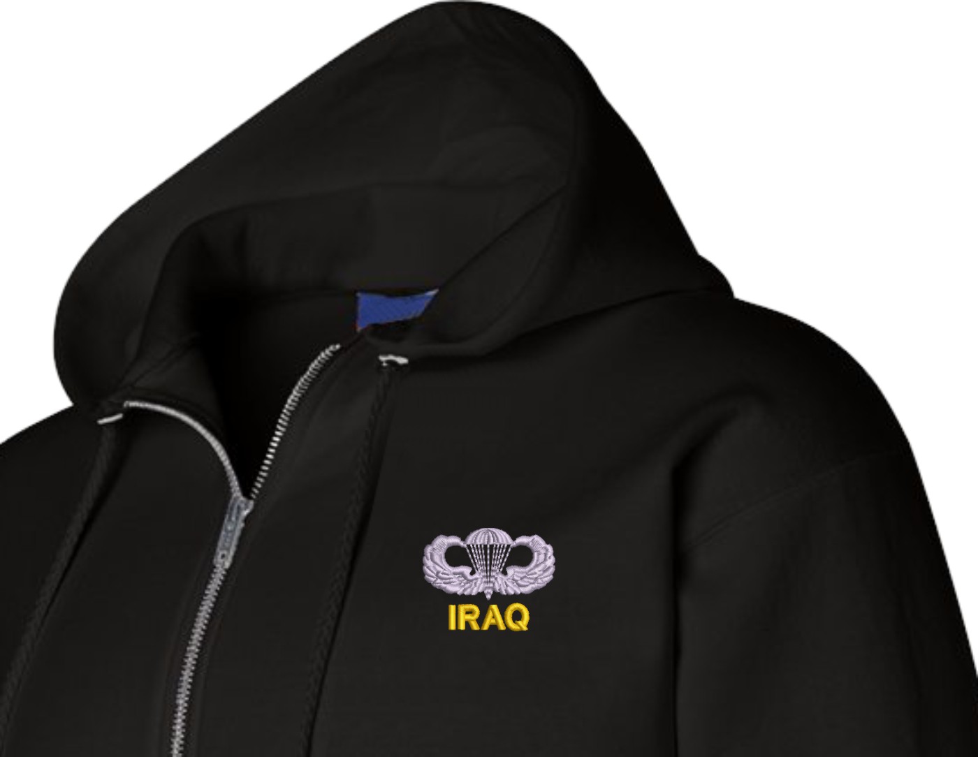 MilitaryBest has expanded its line of apparel with this custom embroidered U.S. Army Iraq Jump Wings Full Zip Hoodie. Each Hoodie is direct embroidered onto a Champion brand 9.5 oz 50/50 Cotton Poly blend. This U.S. Army Iraq Jump Wings Full Zip Hoodie will make an excellent addition to your wardrobe, or a great gift. Your satisfaction is Guaranteed! This U.S. Army Iraq Jump Wings Full Zip Hoodie is custom embroidered at our facilities in Scottsboro, AL.