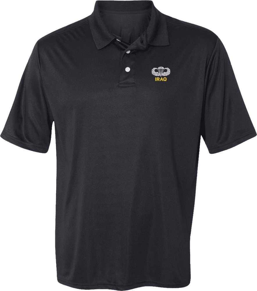 MilitaryBest has expanded its line of apparel with this custom embroidered U.S. Army Iraq Jump Wings Moisture Wicking Polo. This Polo is made using 50/50 cotton/polyester moisture wicking material. This U.S. Army Iraq Jump Wings Moisture Wicking Polo will make an excellent addition to your wardrobe, or a great gift. Your satisfaction is guaranteed! Each U.S. Army Iraq Jump Wings Moisture Wicking Polo is directly embroidered at our facilities in Scottsboro, AL.