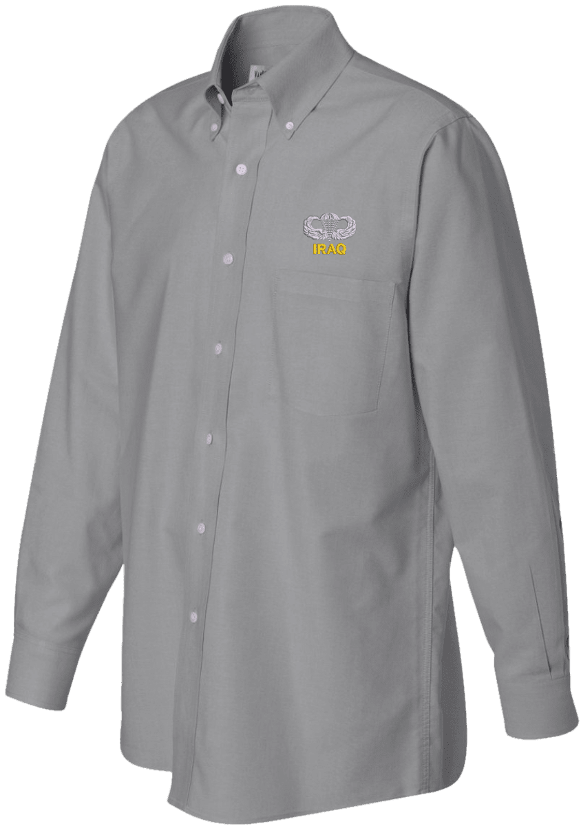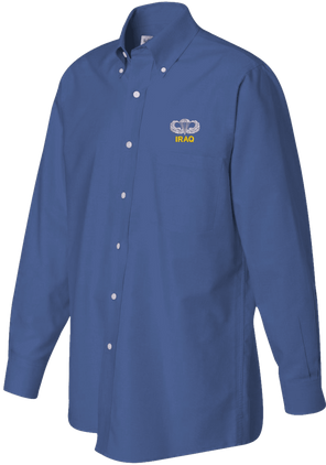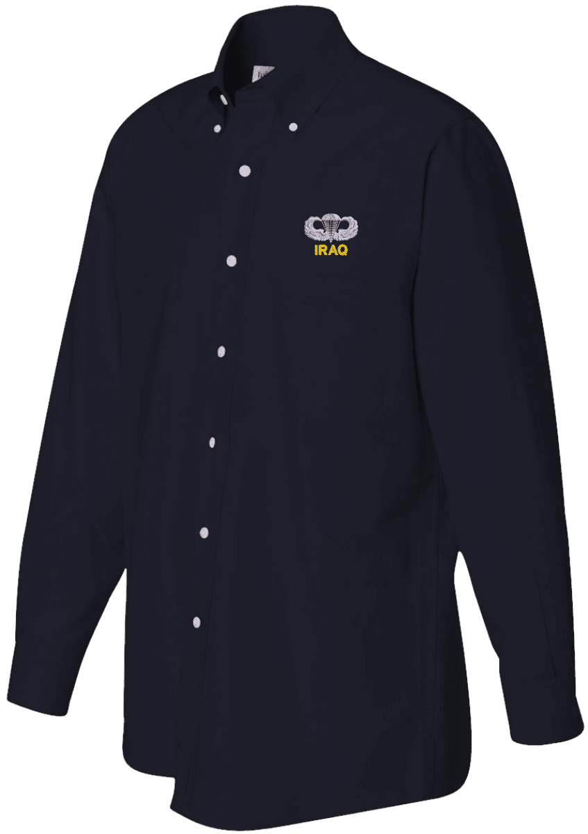Note: Some of the Color Options pictured may not be available. Available Color Options are listed on the drop down menu above.MilitaryBest has expanded its line of apparel with this custom embroidered U.S. Army Iraq Jump Wings Oxford Shirt. This Van Heusen brand Oxford long sleeve button down dress shirt is made using a wrinkle-free, pill and stain resistant 60/40 cotton/polyester material. This U.S. Army Iraq Jump Wings Oxford Shirt will make an excellent addition to your wardrobe or a quality gift. This U.S. Army Iraq Jump Wings Oxford Shirt is custom embroidered at our facilities in Scottsboro, Alabama.