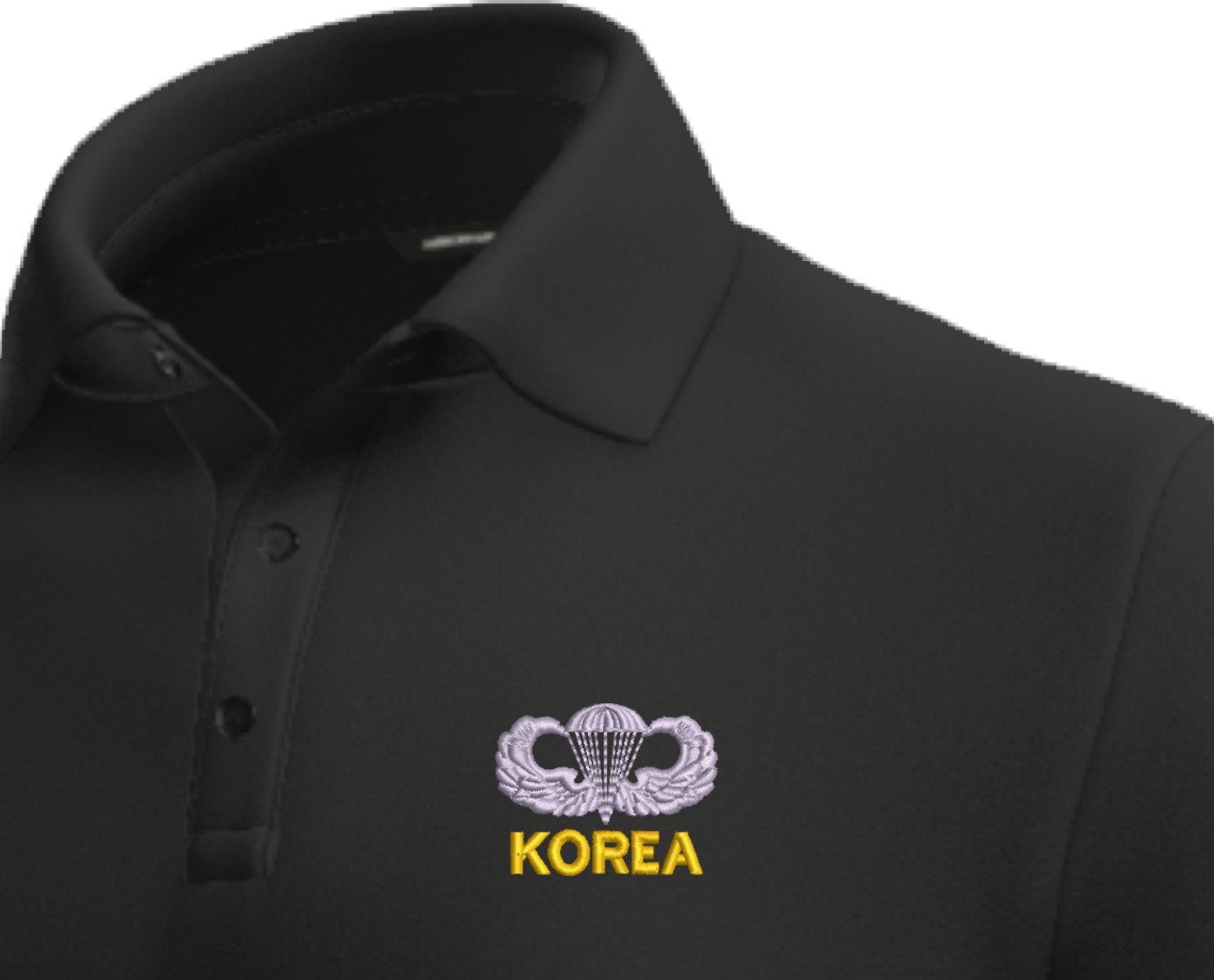 MilitaryBest has expanded its line of apparel with this custom embroidered U.S. Army Korea Jump Wings Moisture Wicking Polo. This Polo is made using 50/50 cotton/polyester moisture wicking material. This U.S. Army Korea Jump Wings Moisture Wicking Polo will make an excellent addition to your wardrobe, or a great gift. Your satisfaction is guaranteed! Each U.S. Army Korea Jump Wings Moisture Wicking Polo is directly embroidered at our facilities in Scottsboro, AL.