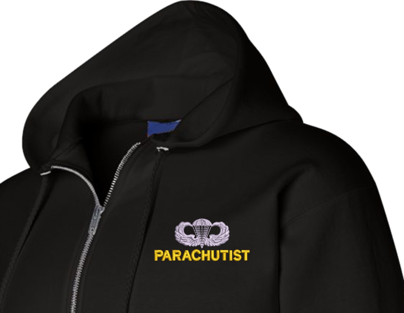 MilitaryBest has expanded its line of apparel with this custom embroidered U.S. Army Parachutist Jump Wings Full Zip Hoodie. Each Hoodie is direct embroidered onto a Champion brand 9.5 oz 50/50 Cotton Poly blend. This U.S. Army Parachutist Jump Wings Full Zip Hoodie will make an excellent addition to your wardrobe, or a great gift. Your satisfaction is Guaranteed! This U.S. Army Parachutist Jump Wings Full Zip Hoodie is custom embroidered at our facilities in Scottsboro, AL.
