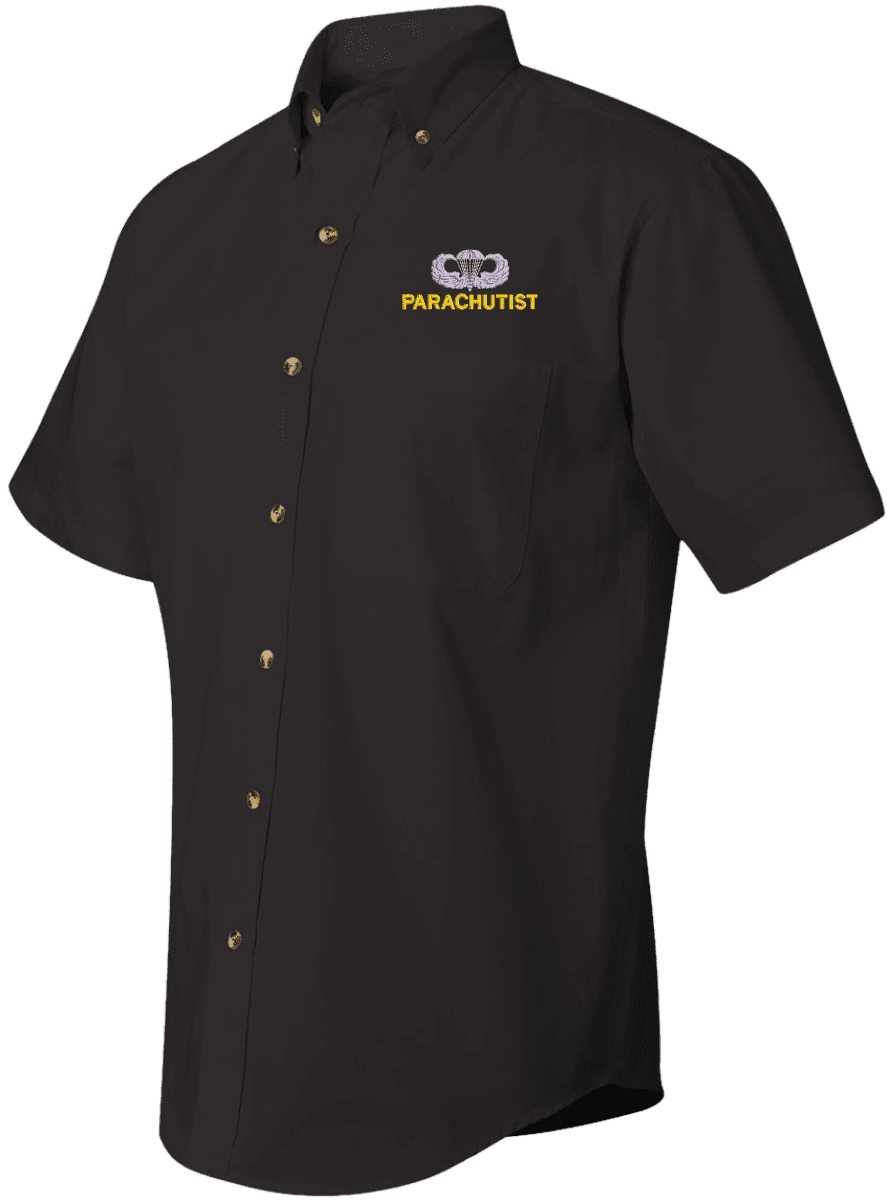 We are selling out of our remaining inventory of this discontinued item at a limited supply.MilitaryBest has expanded its line of apparel with this custom embroidered U.S. Army Parachutist Jump Wings Short Sleeve Dress Shirt. This Featherlite brand short sleeve button down dress shirt is made using a stain-resistant 60/40 cotton/polyester twill material. This U.S. Army Parachutist Jump Wings Short Sleeve Dress Shirt will make an excellent addition to your wardrobe or a quality gift. This U.S. Army Parachutist Jump Wings Short Sleeve Dress Shirt is custom embroidered at our facilities in Scottsboro, Alabama.