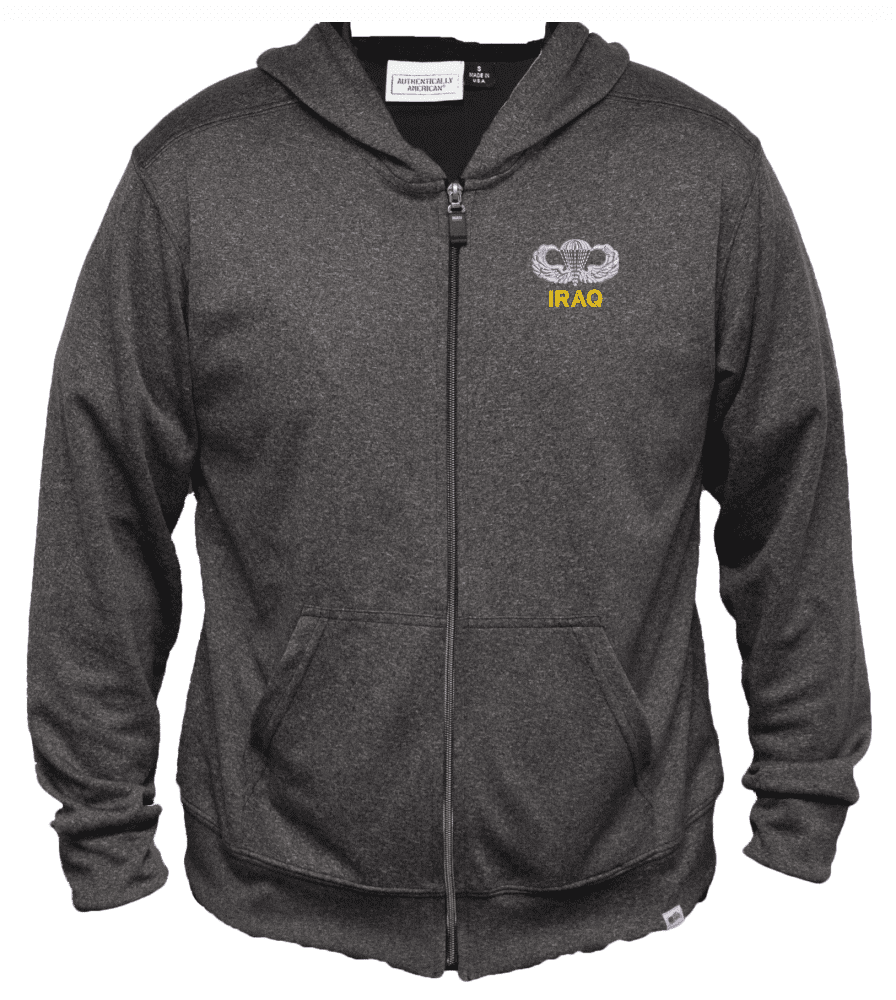 MilitaryBest proudly offers this top-quality U.S. Army Iraq Jump Wings Men's 100% Polyester Heather Grey Full-Zip Hoodie. We have proudly partnered with Authentically American to offer you this Made in the USA Hoodie. Water & wrinkle resistance make this zip hoodie the perfect layering piece from the golf course to you favorite travel destination.As with all MilitaryBest items, our designs are Officially Licensed. A percentage of the sale of each MilitaryBest item is forwarded to the licensing department in support of it's MWR (Morale, Welfare, & Recreation) program. These payments are made by either ALL4U LLC or the wholesaler from where the item originated. Our team thanks you for your service and your support of these programs.