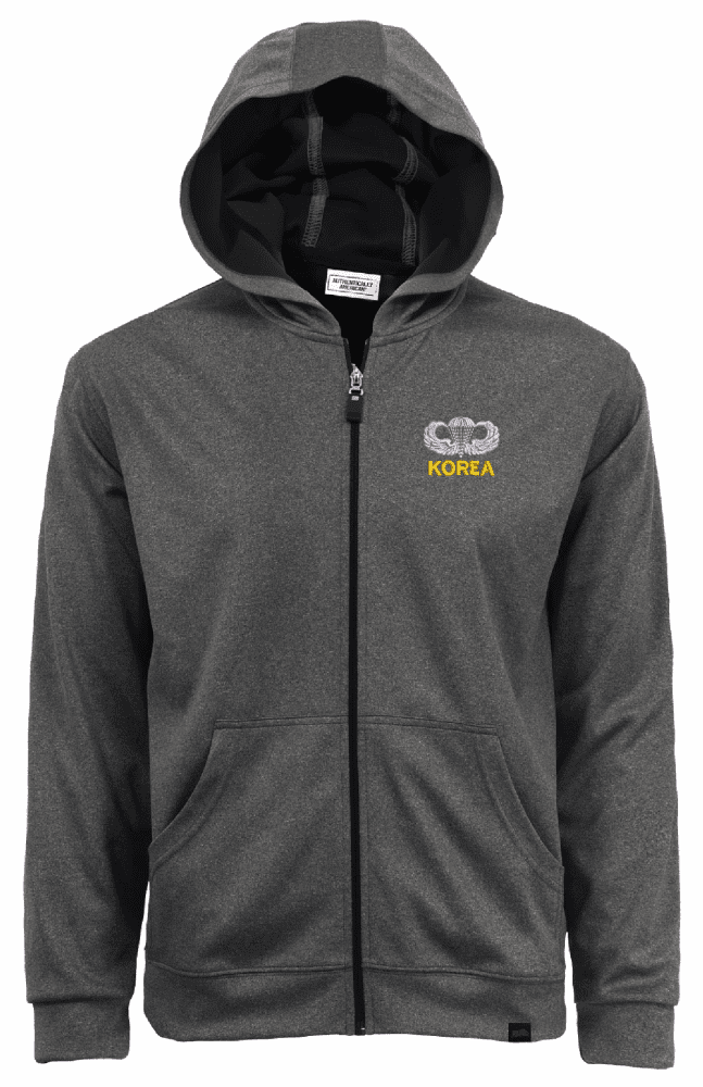 MilitaryBest proudly offers this top-quality U.S. Army Korea Jump Wings Men's 100% Polyester Heather Grey Full-Zip Hoodie. We have proudly partnered with Authentically American to offer you this Made in the USA Hoodie. Water & wrinkle resistance make this zip hoodie the perfect layering piece from the golf course to you favorite travel destination.As with all MilitaryBest items, our designs are Officially Licensed. A percentage of the sale of each MilitaryBest item is forwarded to the licensing department in support of it's MWR (Morale, Welfare, & Recreation) program. These payments are made by either ALL4U LLC or the wholesaler from where the item originated. Our team thanks you for your service and your support of these programs.