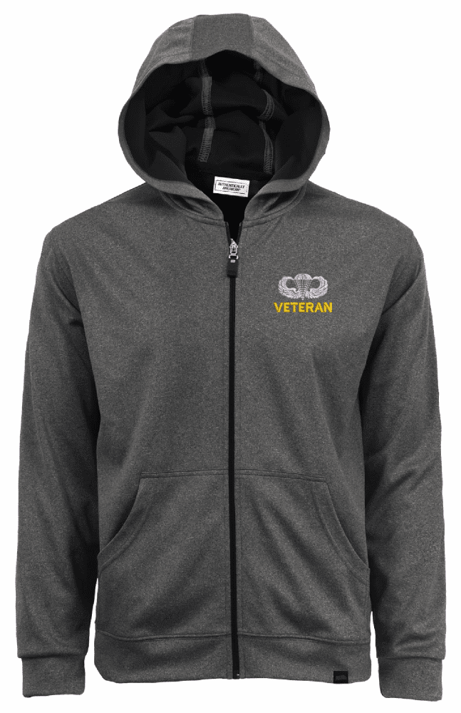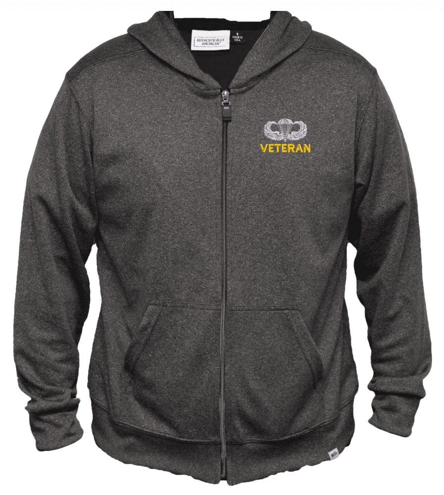 MilitaryBest proudly offers this top-quality U.S. Army Veteran Jump Wings Men's 100% Polyester Heather Grey Full-Zip Hoodie. We have proudly partnered with Authentically American to offer you this Made in the USA Hoodie. Water & wrinkle resistance make this zip hoodie the perfect layering piece from the golf course to you favorite travel destination.As with all MilitaryBest items, our designs are Officially Licensed. A percentage of the sale of each MilitaryBest item is forwarded to the licensing department in support of it's MWR (Morale, Welfare, & Recreation) program. These payments are made by either ALL4U LLC or the wholesaler from where the item originated. Our team thanks you for your service and your support of these programs.