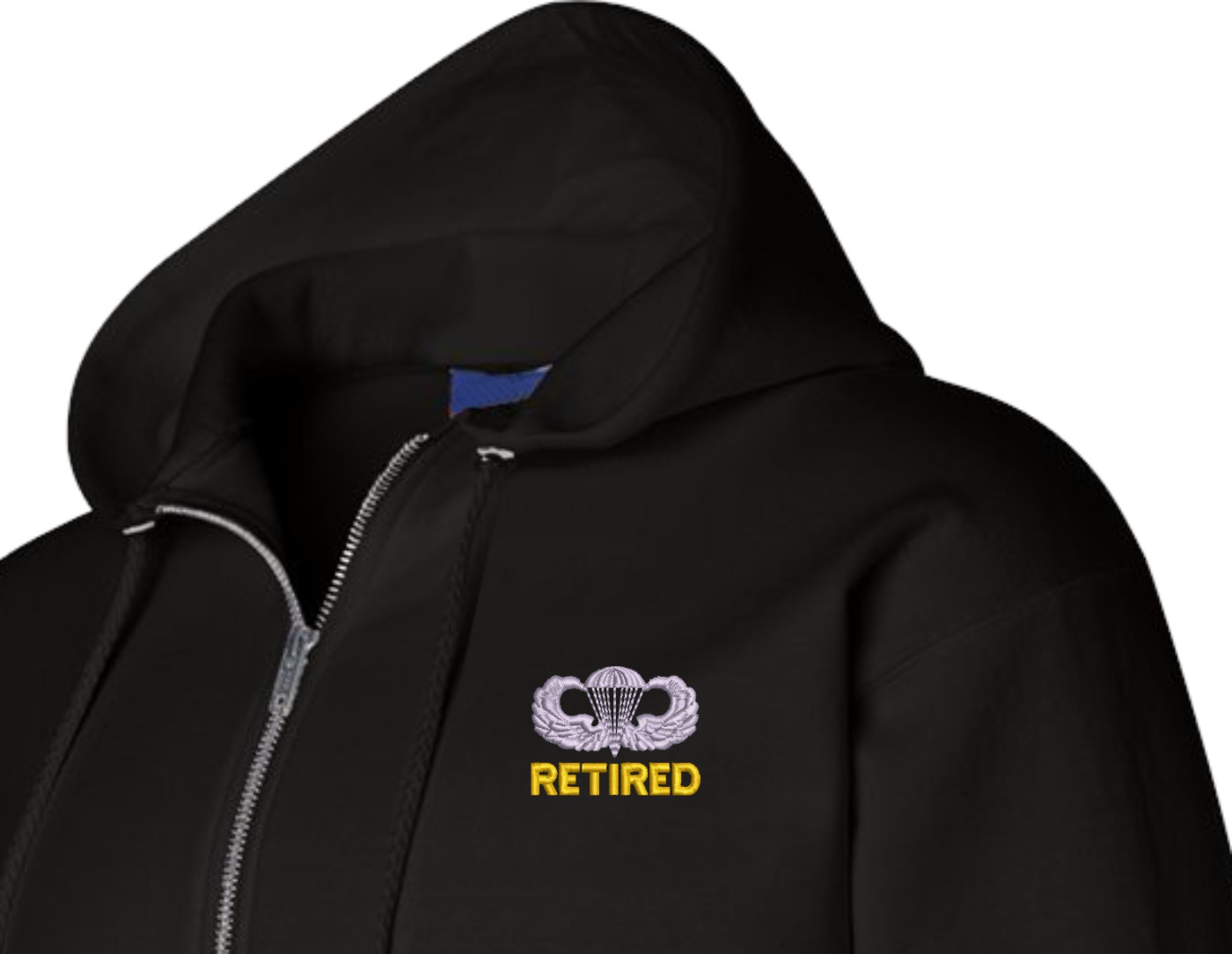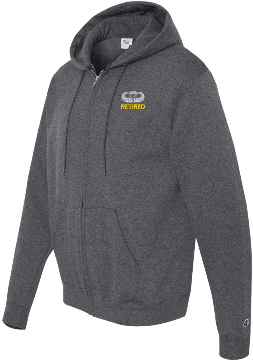 MilitaryBest has expanded its line of apparel with this custom embroidered U.S. Army Retired Jump Wings Full Zip Hoodie. Each Hoodie is direct embroidered onto a Champion brand 9.5 oz 50/50 Cotton Poly blend. This U.S. Army Retired Jump Wings Full Zip Hoodie will make an excellent addition to your wardrobe, or a great gift. Your satisfaction is Guaranteed! This U.S. Army Retired Jump Wings Full Zip Hoodie is custom embroidered at our facilities in Scottsboro, AL.