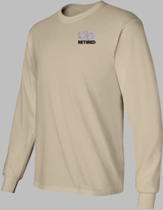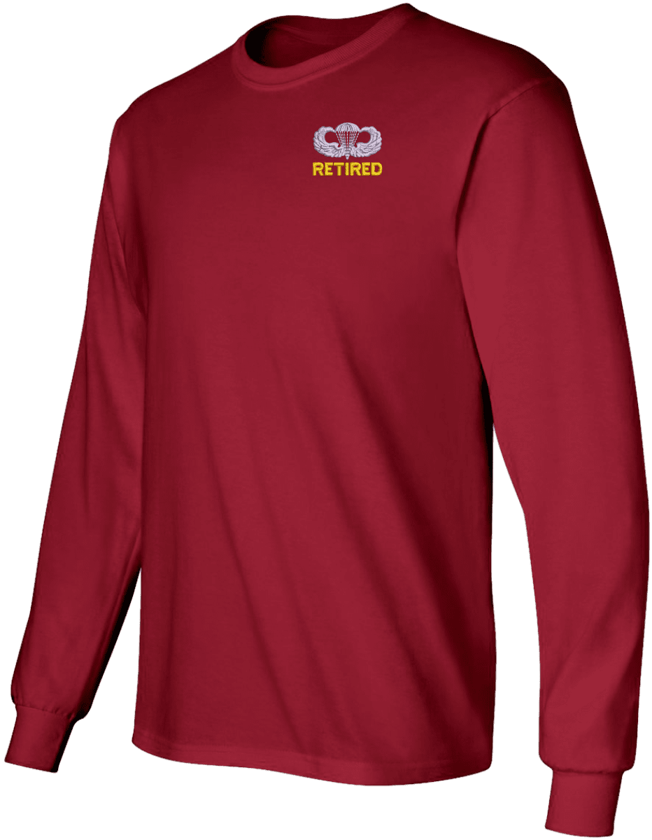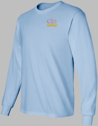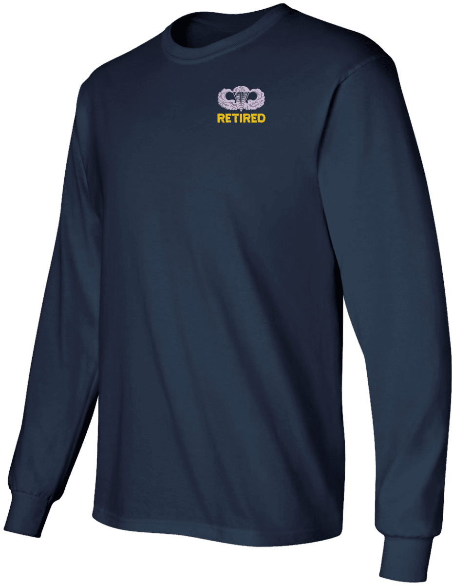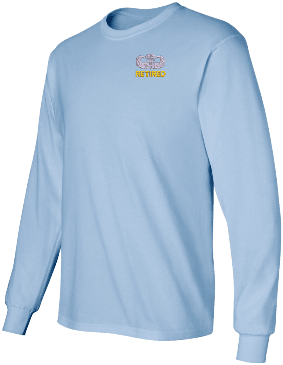 Note: Some of the Color Options pictured may not be available. Available Color Options are listed on the drop down menu above.MilitaryBest has expanded its line of apparel with this custom embroidered U.S. Army Retired Jump Wings Long Sleeve T-Shirt. This Gildan brand long sleeve t-shirt is made using a 6 oz pre-shrunk 100% cotton material. This U.S. Army Retired Jump Wings Long Sleeve T-Shirt will make an excellent addition to your wardrobe or a quality gift. This U.S. Army Retired Jump Wings Long Sleeve T-Shirt is custom embroidered at our facilities in Scottsboro, Alabama.