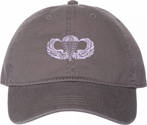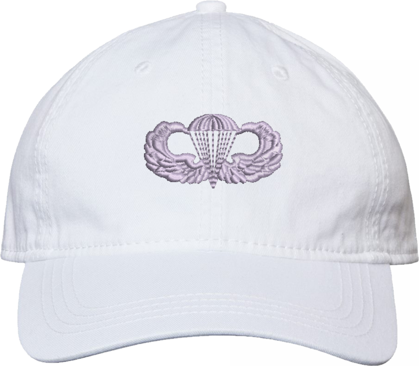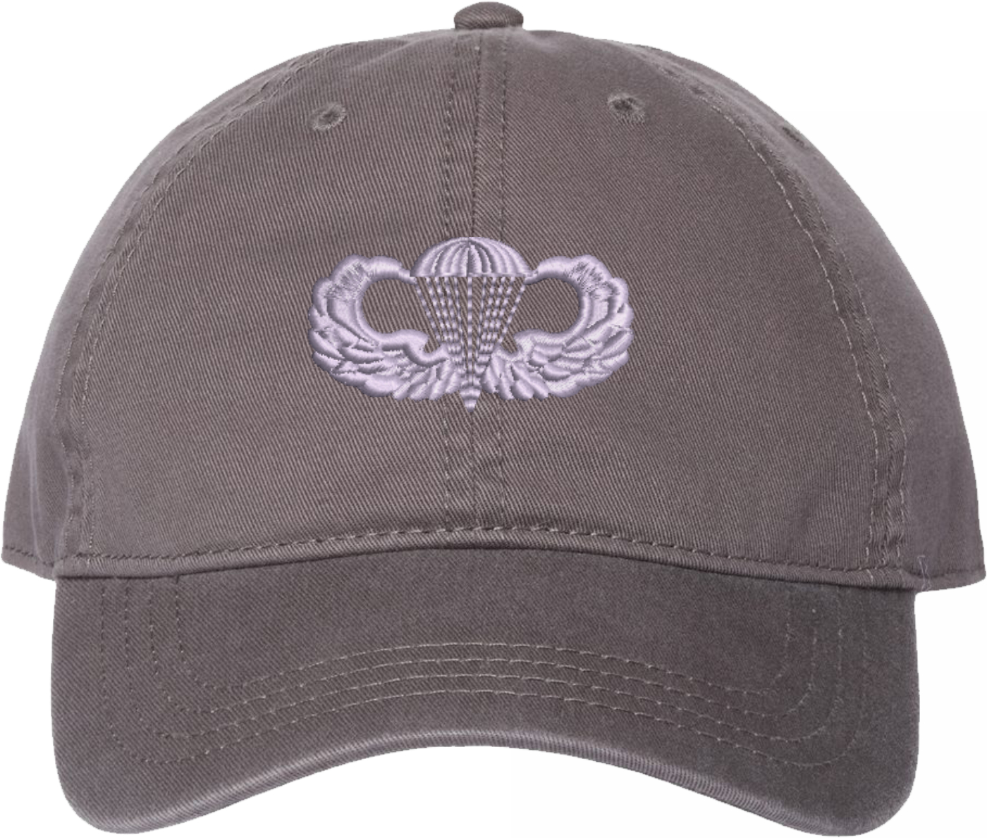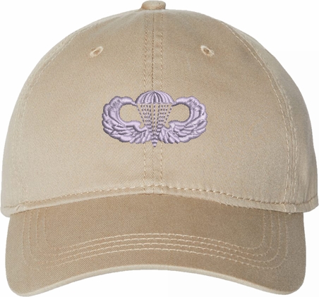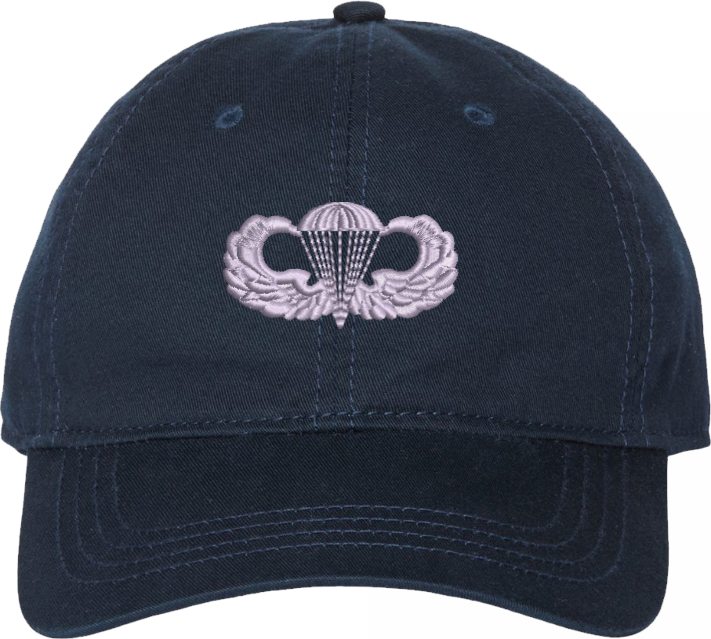 Show your Army pride with this U.S. Army Jump Wings Unstructured Dad Cap from MilitaryBest. Crafted from 100% washed chino twill cotton, this six-panel, low-profile cap offers a relaxed and comfortable fit. Featuring high-quality embroidery done in our Scottsboro, Alabama facility, this cap is designed with a pre-curved visor and an adjustable tri-glide buckle closure for a perfect fit. Whether for everyday wear or as a meaningful gift, this cap is a great way to honor your own or a loved one's service.For caps ordered with custom embroidered personalized text please allow an additional 3 to 5 days production time. All custom back text will be embroidered in ALL CAPITAL LETTERS. Caps with back text or eggs are non-returnable unless there is a material defect in the cap.