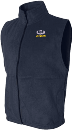 Due to supply chain disruptions, some colors and sizes may not be available in the same Brand, in these cases a brand of comparable quality will be used. Feel free to call in advance of your order, with questions you may have.MilitaryBest is expanding its line of Men's apparel with this quality U.S. Army Veteran Jump Wings Full-Zip Fleece Vest. This U.S. Army Veteran Jump Wings Full-Zip Fleece Vest features a convertible collar with dyed-to-match zipper pull, oversized nylon reinforced slash pockets, and an elastic hem. It is made using a 100% anti-pill polyester Fleece Vest. This U.S. Army Veteran Jump Wings Full-Zip Fleece Vest will make an excellent addition to your wardrobe, or a quality gift. Your satisfaction is guaranteed! These Vests are custom embroidered at our facilities in Scottsboro, AL.